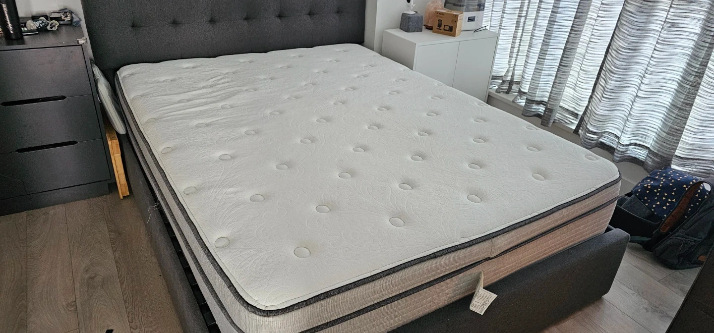 This is a Beautyrest mattress. It has a quilted top surface with a patterned design. The sides feature a textured fabric with a dark grey trim. Hardly used, always protected using a mattress topper.
