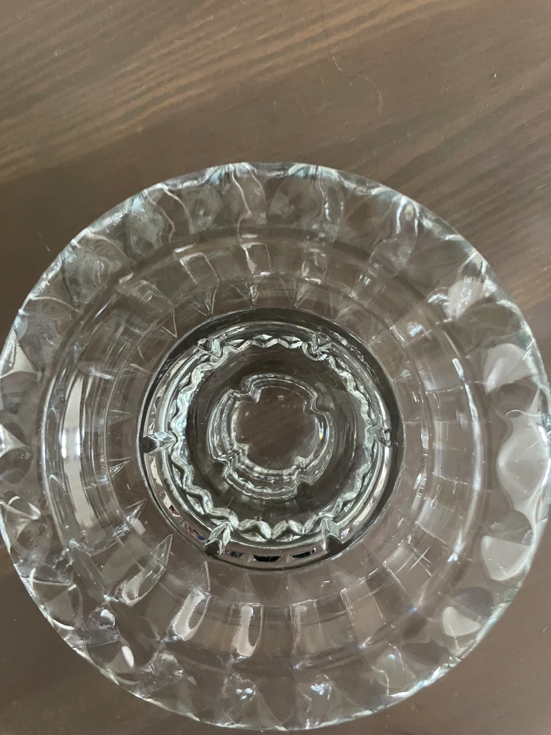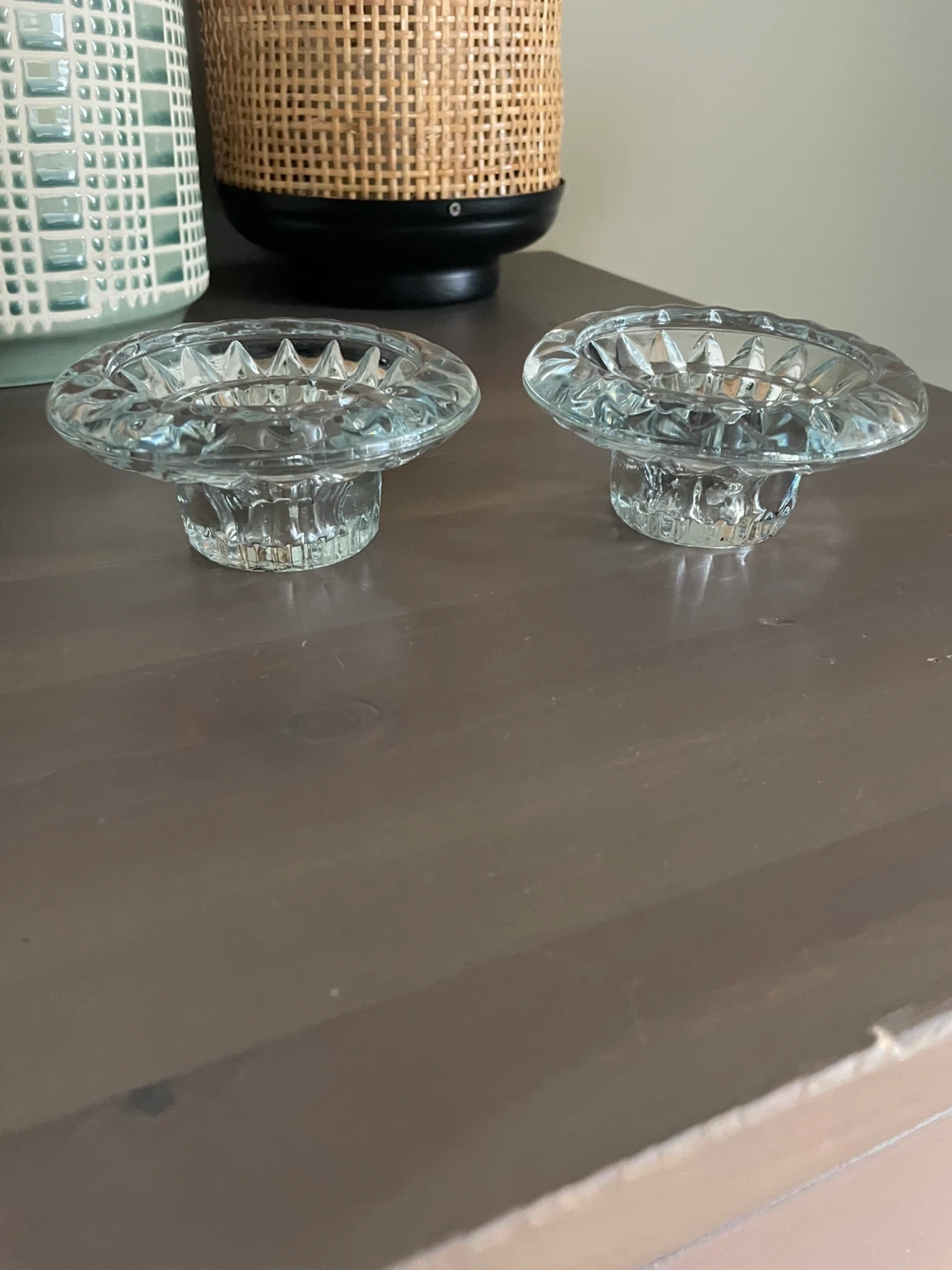 These are two clear glass taper candle holders. They're made of cut glass with a fluted edge. Great for creating a cozy ambiance!