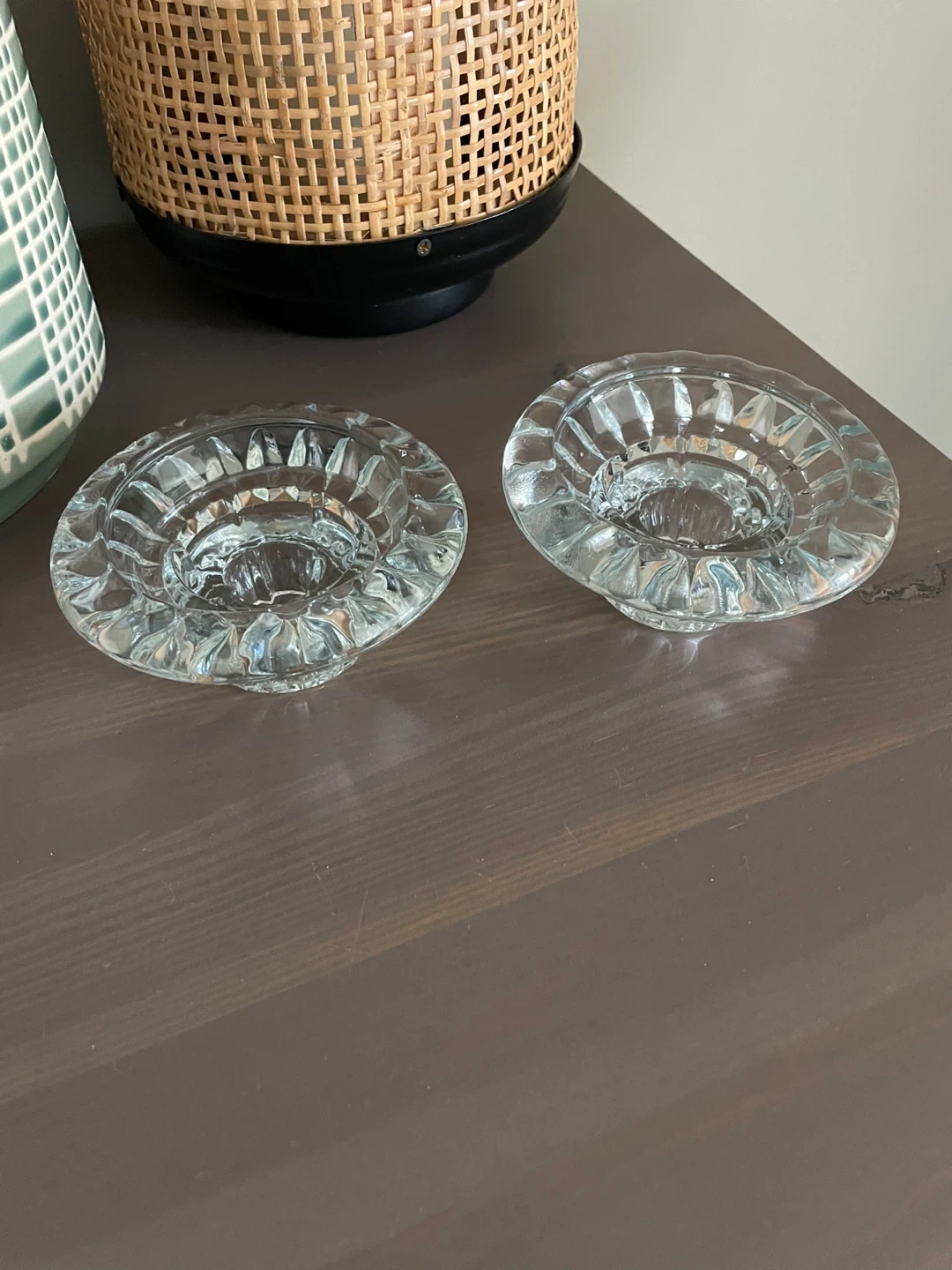 These are two clear glass taper candle holders. They're made of cut glass with a fluted edge. Great for creating a cozy ambiance!