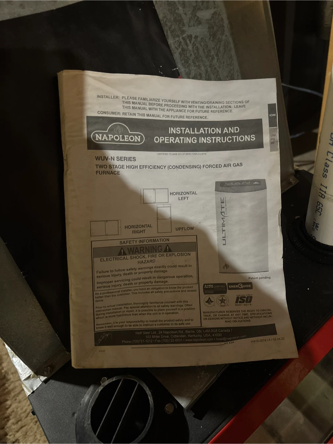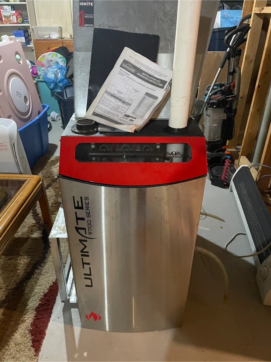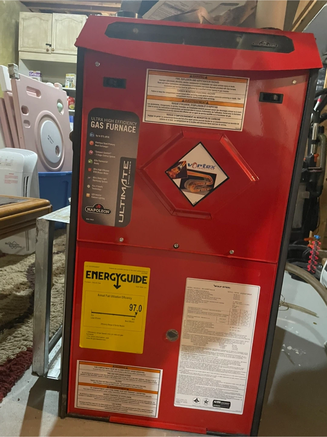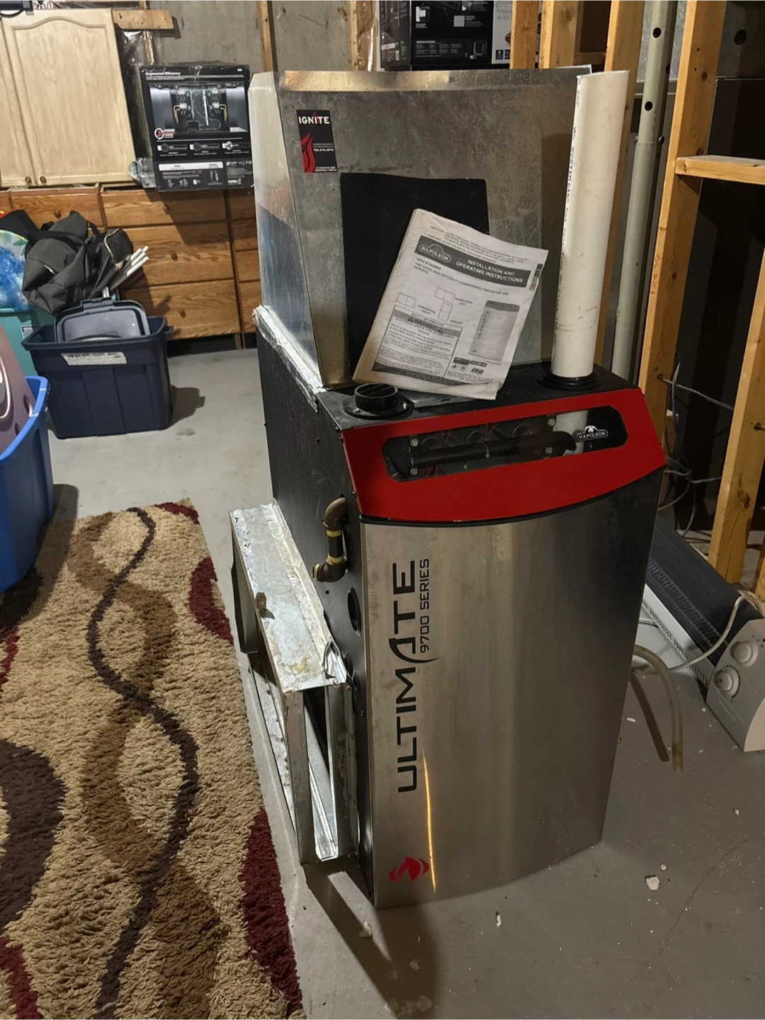 This is a Napoleon Ultimate 9700 Series gas furnace. It's a two-stage high-efficiency condensing furnace. Installation and operating instructions are included.