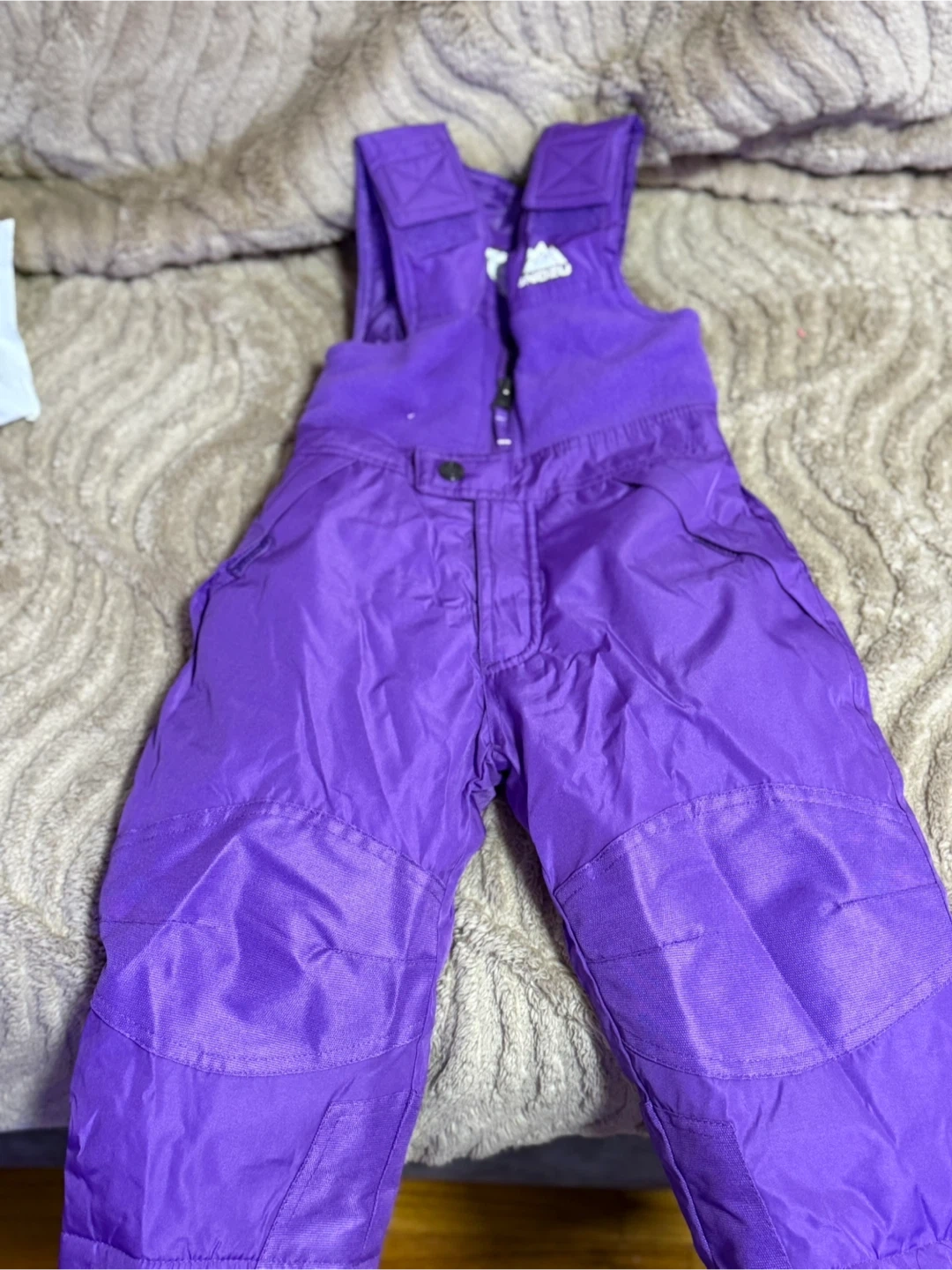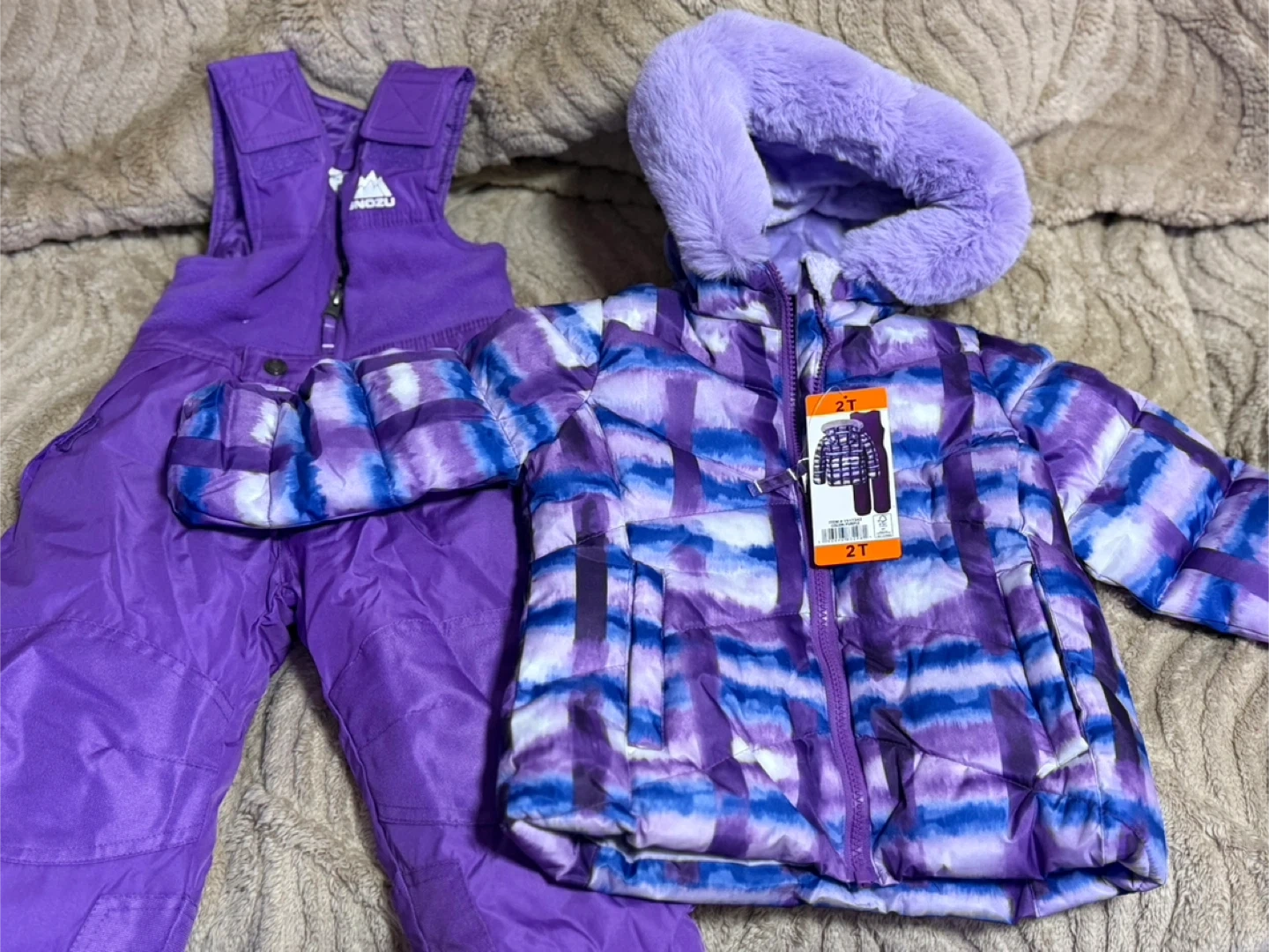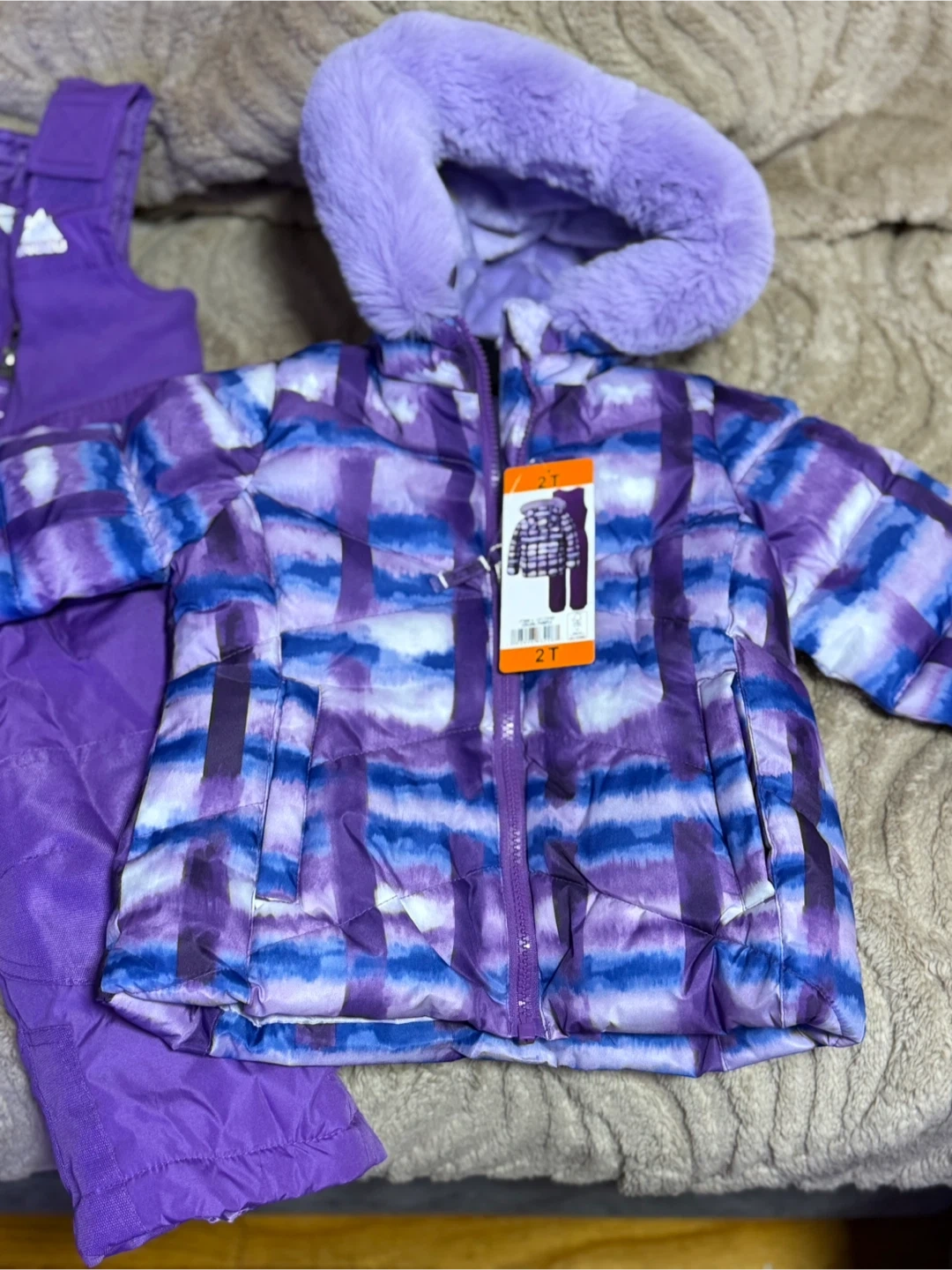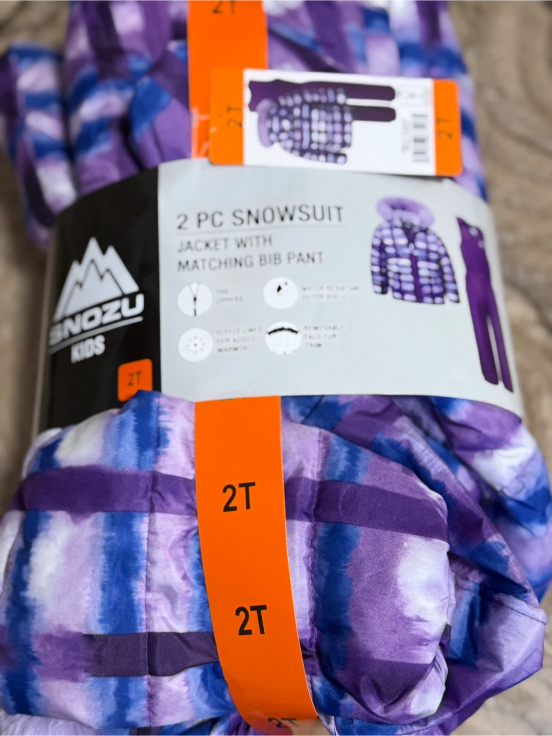 This Snozu 2-piece snowsuit set includes a jacket with a faux fur-trimmed hood and matching bib pants. It's sized for 2T toddlers. Perfect for staying warm and dry during winter play!