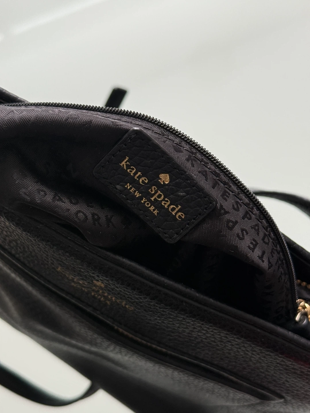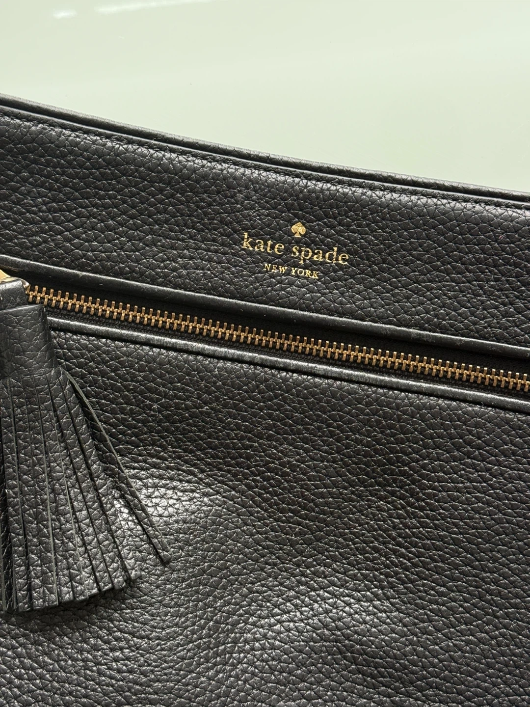 This is a black pebbled leather crossbody bag from Kate Spade New York. It features a front zip pocket with a tassel detail and an adjustable shoulder strap. The interior is lined and includes pockets for organization.
