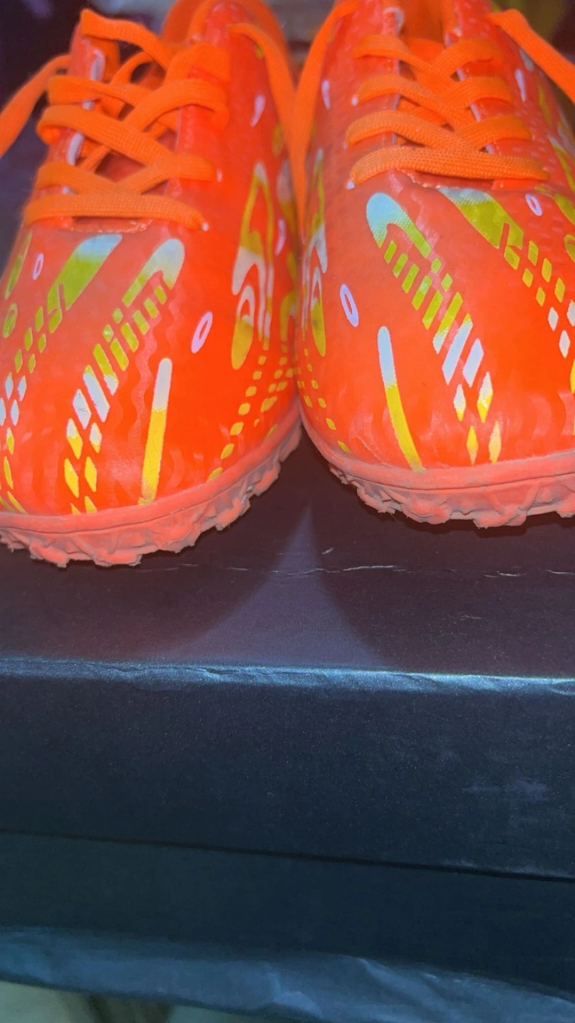 These orange BAODISI soccer cleats feature a vibrant design. They have a durable sole suitable for turf or firm ground. A great choice for young players hitting the field!