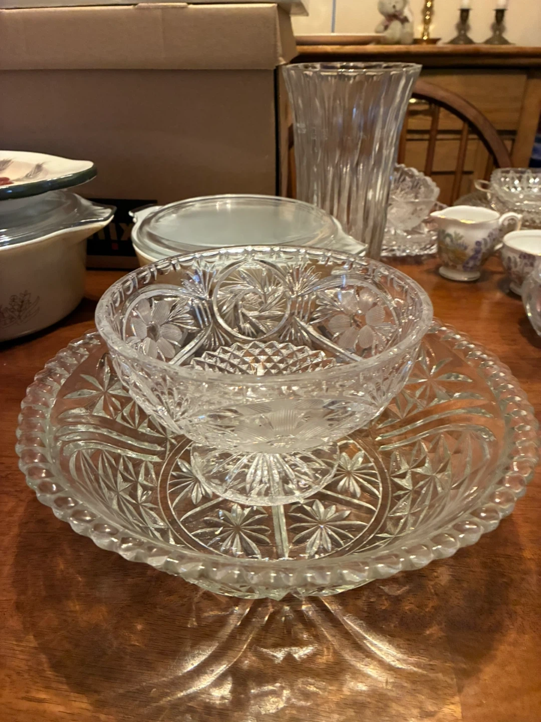 A beautiful crystal cut glass vase with a classic starburst and fan pattern. It's perfect for displaying flowers! Made of clear glass. And crystal cut bowls