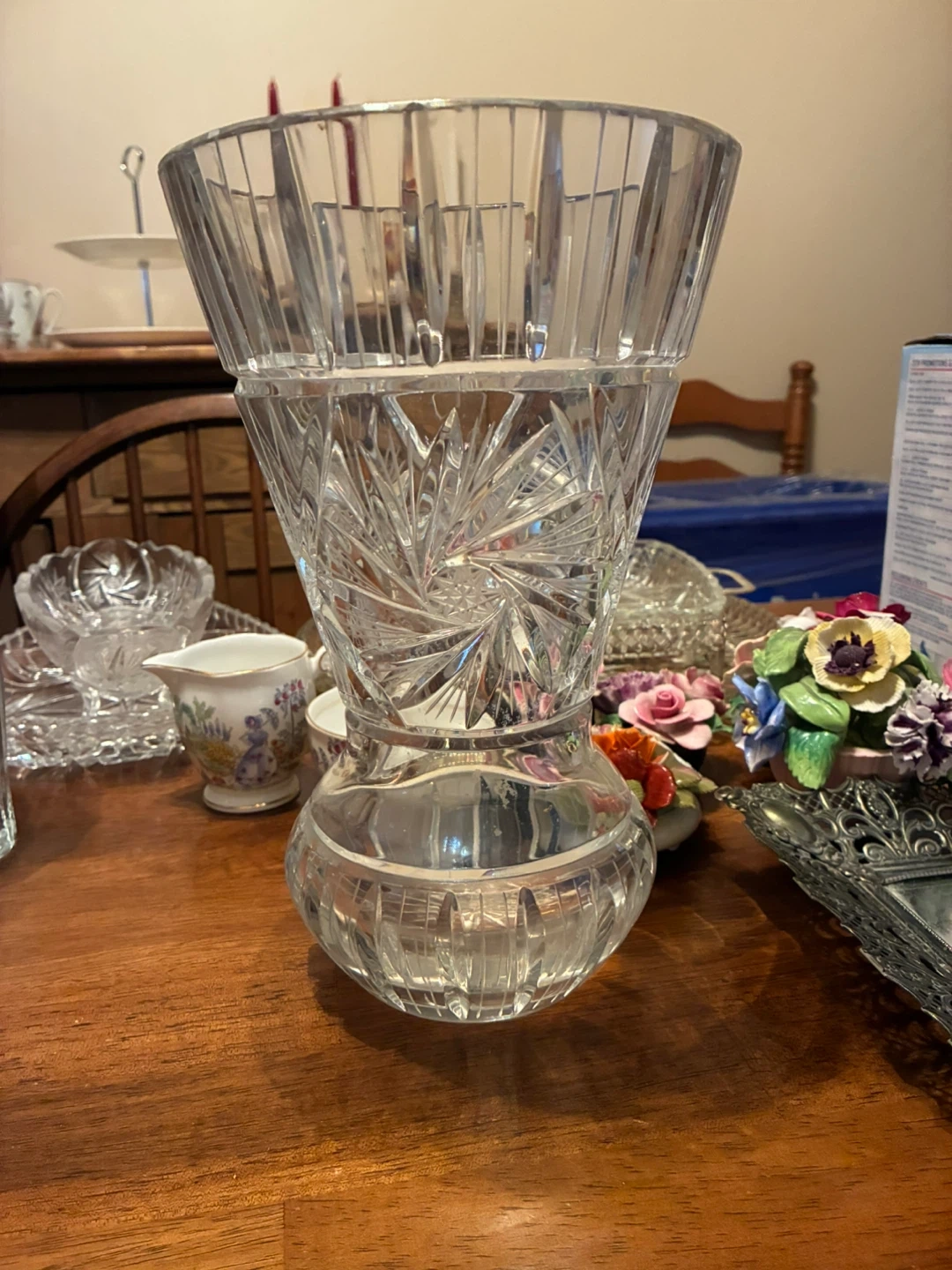 A beautiful crystal cut glass vase with a classic starburst and fan pattern. It's perfect for displaying flowers! Made of clear glass. And crystal cut bowls