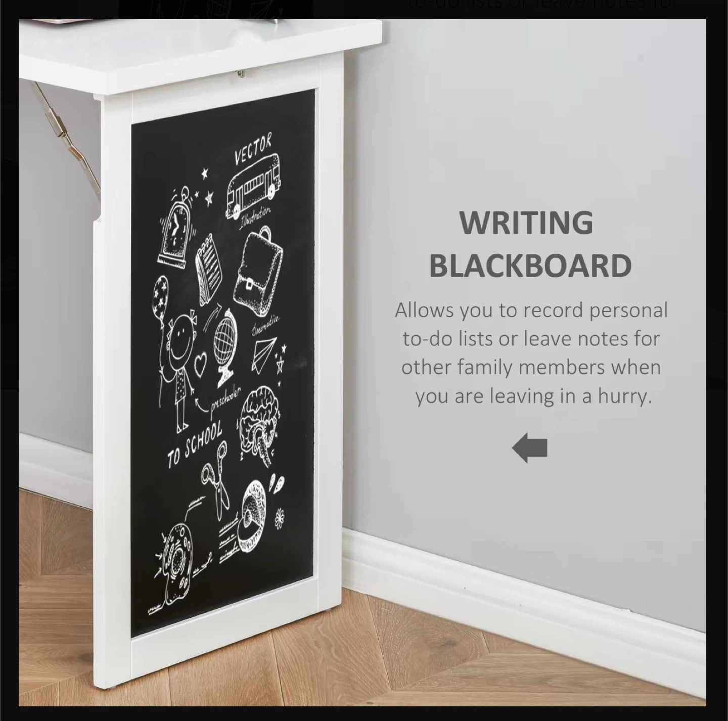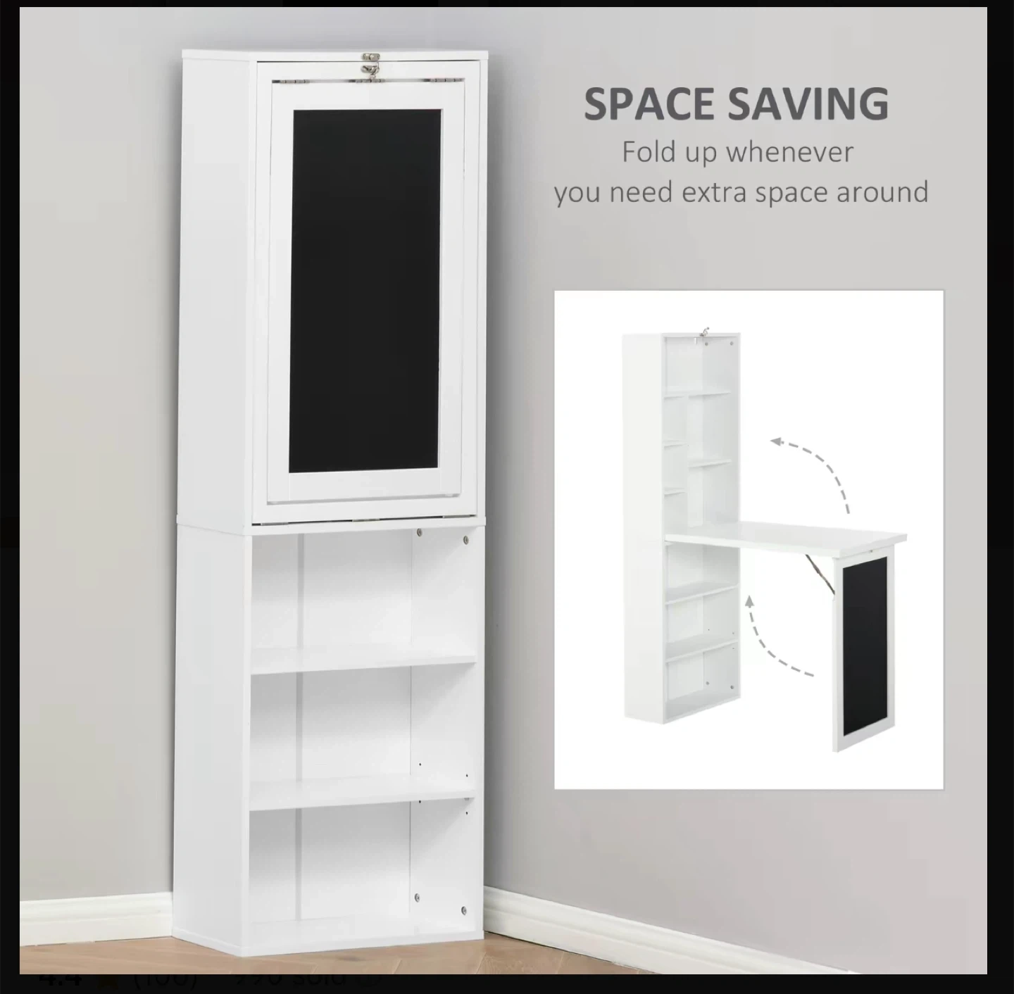Selling a HOMCOM fold-out convertible writing table wall mount desk cabinet with a blackboard and side shelf. This space-saving desk folds up whenever you need extra space around your home. It features a writing blackboard and side shelves for storage. The dimensions are approximately 60.25" high, 20" wide, and 7.75" deep when closed. The desk surface is about 31" wide and 18.75" deep. Originally bought for $179.99!