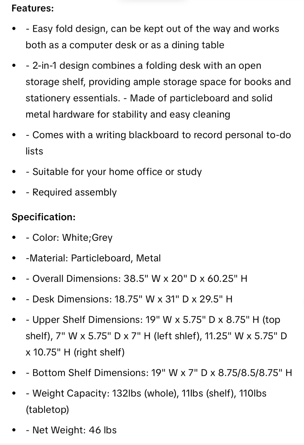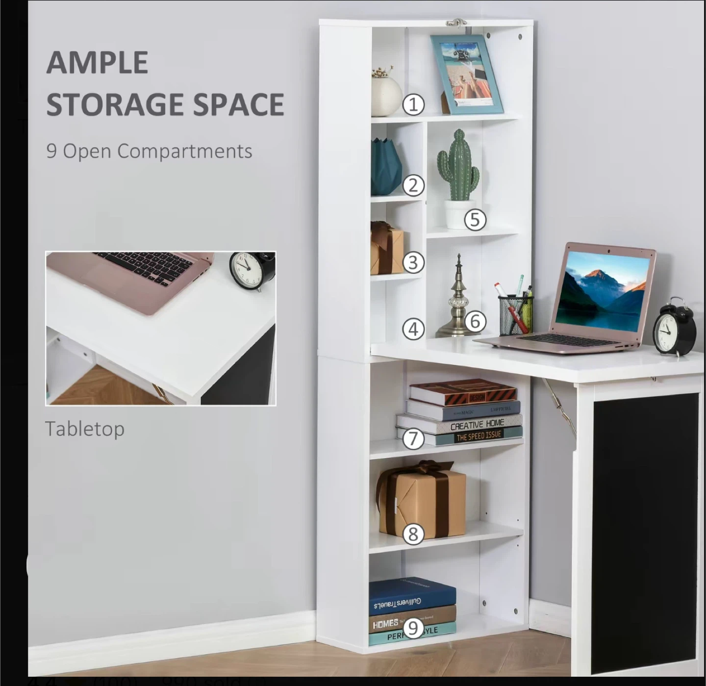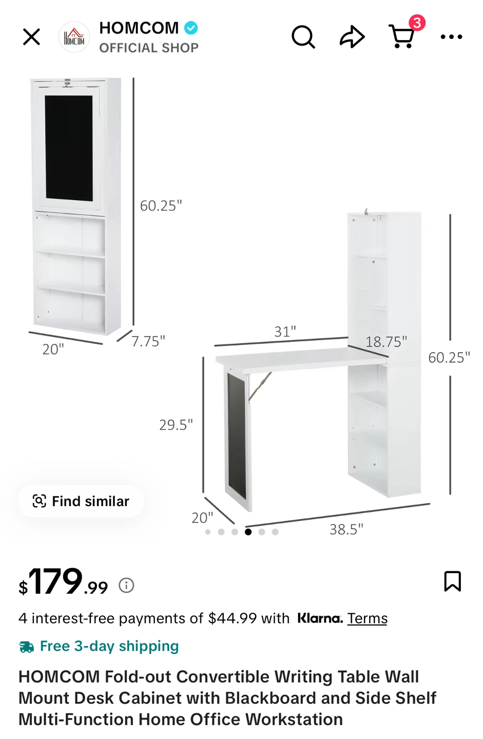 Selling a HOMCOM fold-out convertible writing table wall mount desk cabinet with a blackboard and side shelf. This space-saving desk folds up whenever you need extra space around your home. It features a writing blackboard and side shelves for storage. The dimensions are approximately 60.25" high, 20" wide, and 7.75" deep when closed. The desk surface is about 31" wide and 18.75" deep. Originally bought for $179.99!