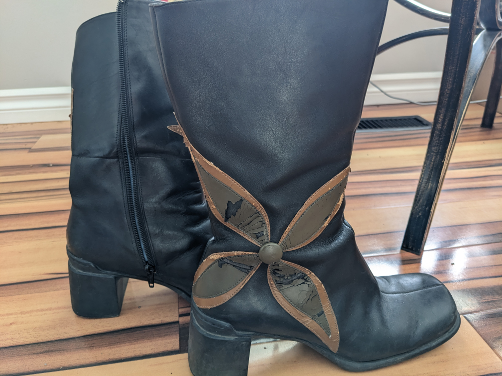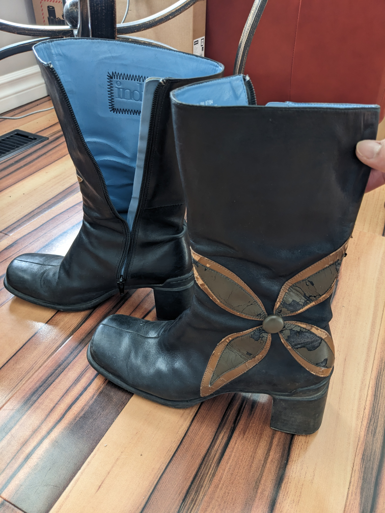 Free boots. The design is coming off, as seen on the pictures, but otherwise in good condition. Very comfortable. Size 8.5/9