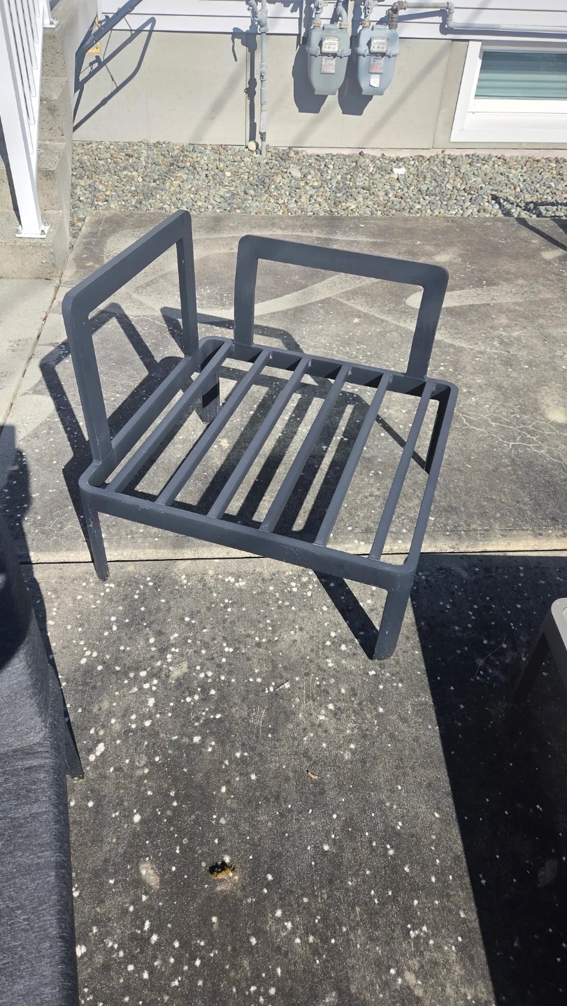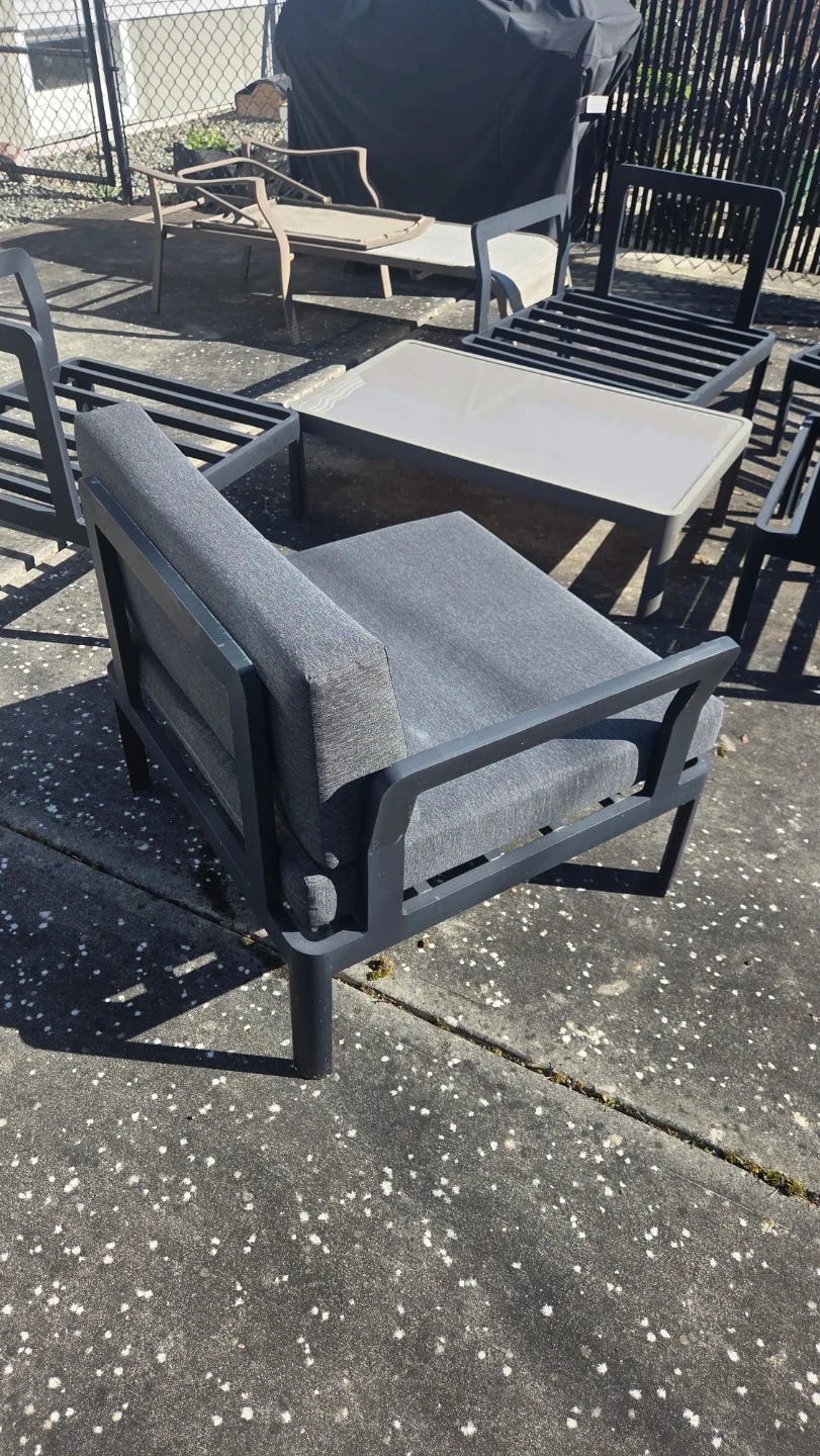 Selling 5 Grey outdoor armchair with dark frame. I've kept the cushions indoor when not in use. Includes cushions for all 5 chairs.