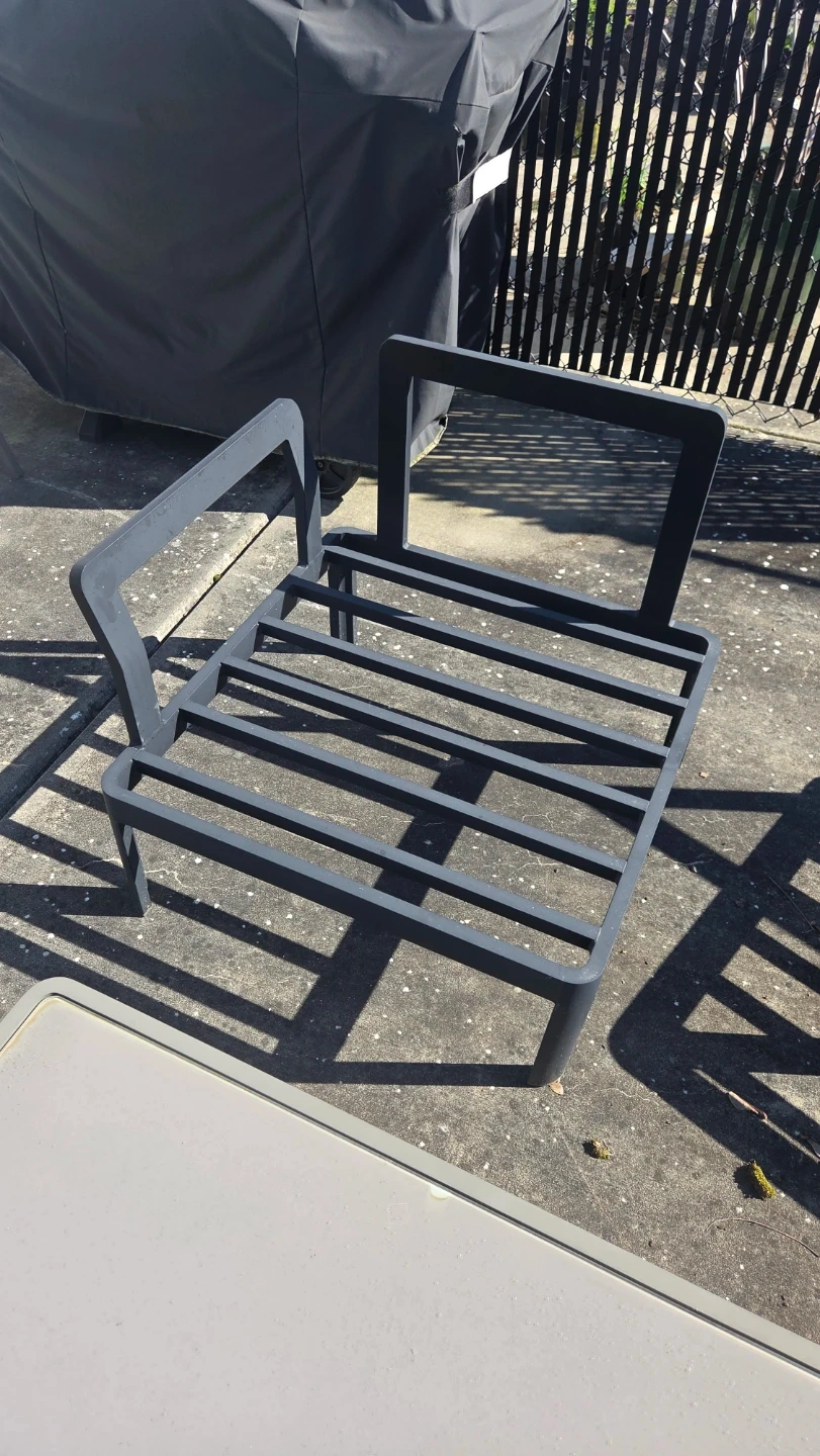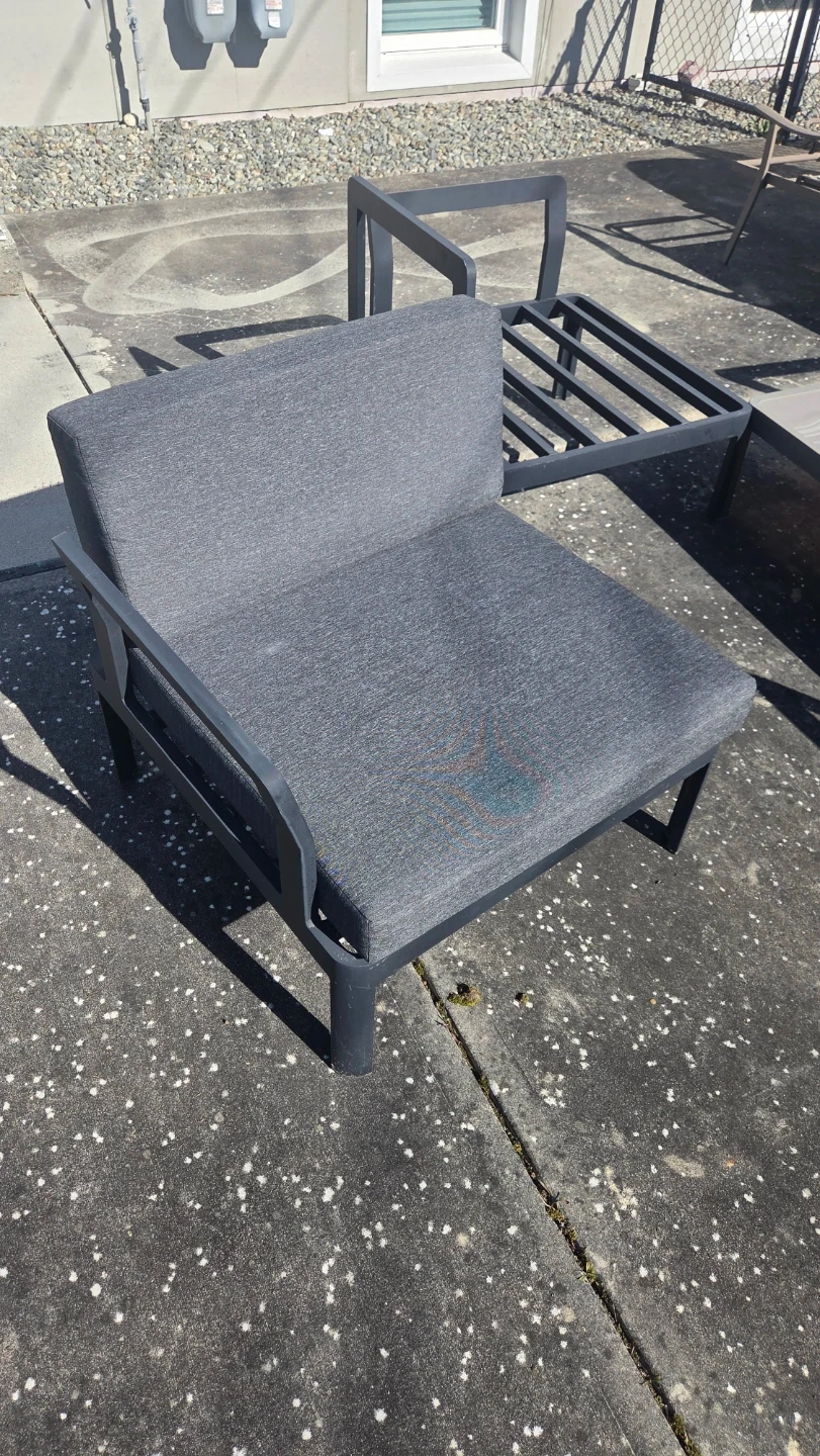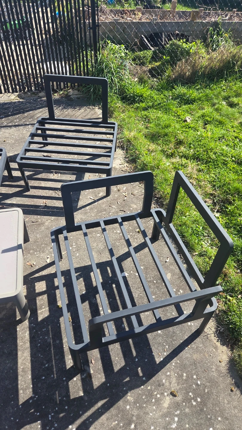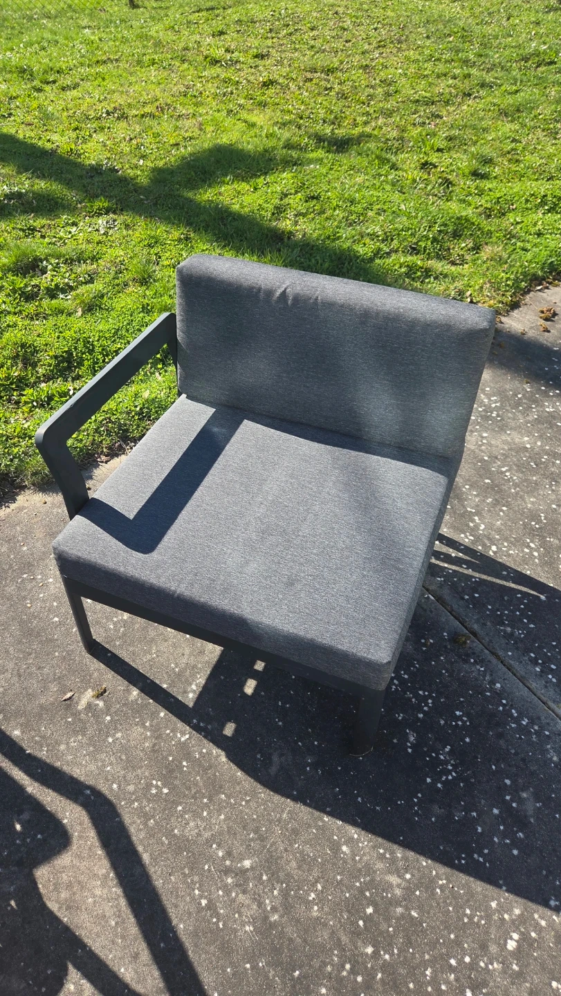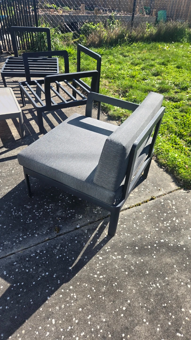 Selling 5 Grey outdoor armchair with dark frame. I've kept the cushions indoor when not in use. Includes cushions for all 5 chairs.