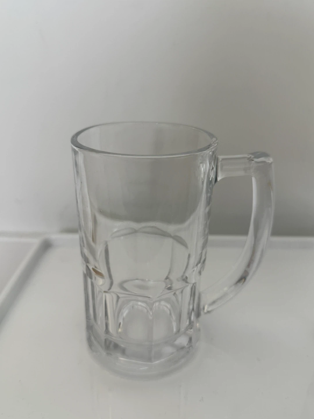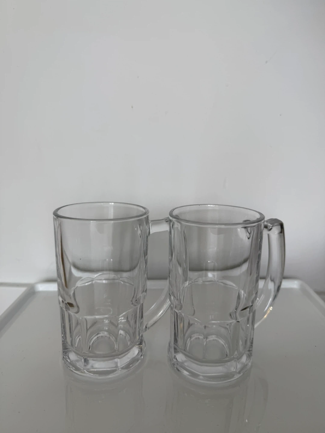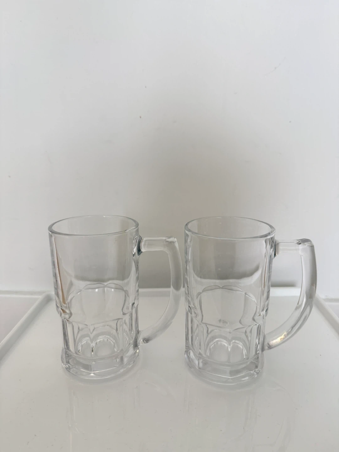 Selling a pair of classic, thick glass beer mugs (steins). These are very sturdy and have a traditional paneled design, perfect for keeping your beer cold.