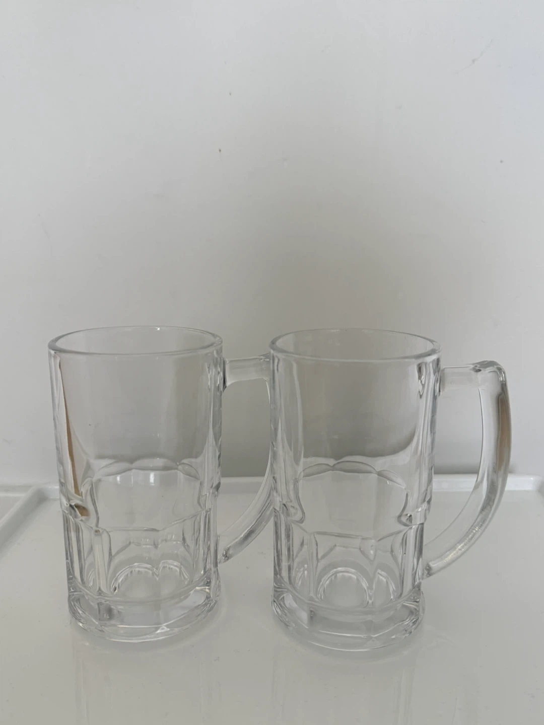 Selling a pair of classic, thick glass beer mugs (steins). These are very sturdy and have a traditional paneled design, perfect for keeping your beer cold.