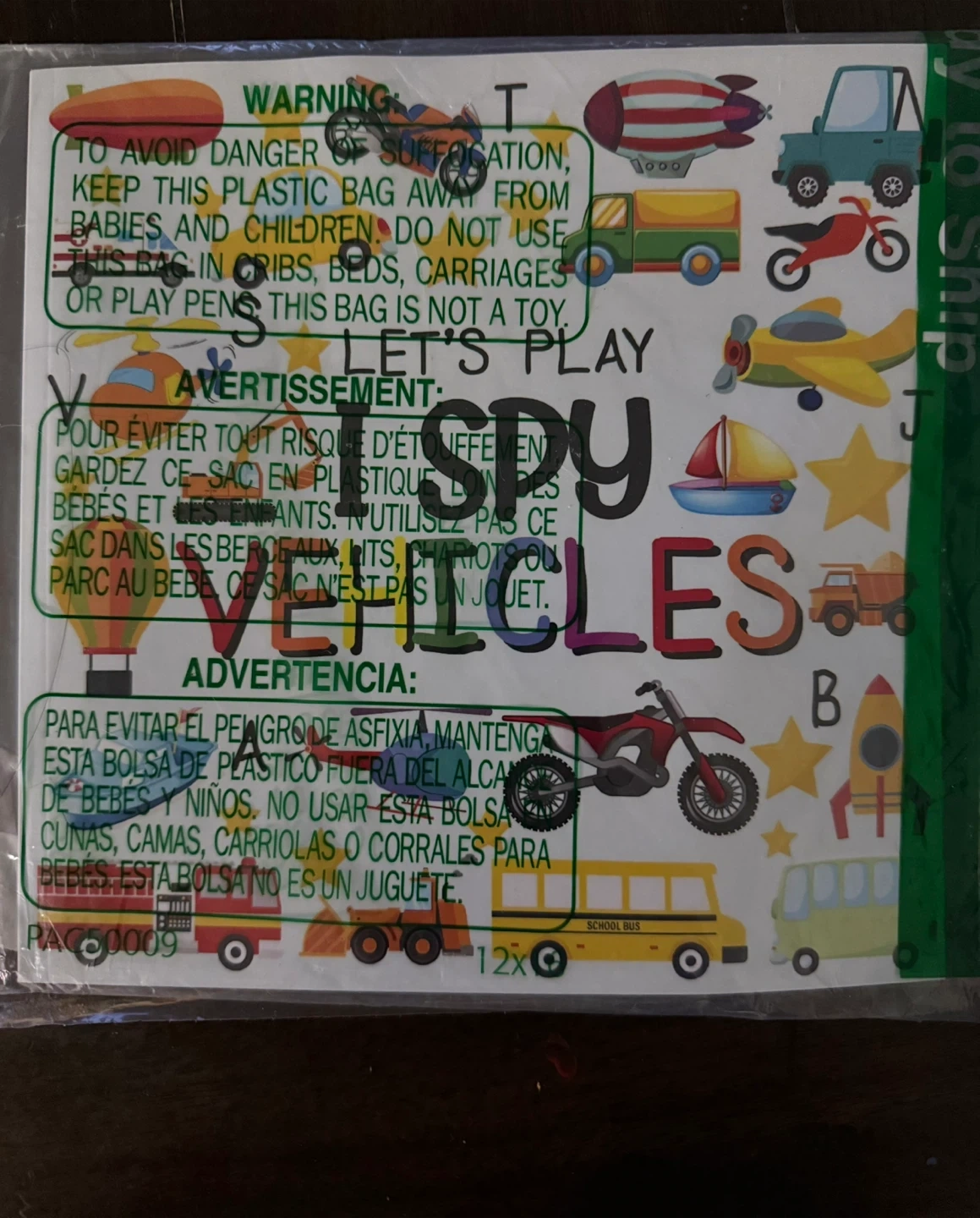 This is a fun 'I Spy' picture puzzle book featuring various vehicles. It's suitable for preschoolers and toddlers. Great for developing observation skills!