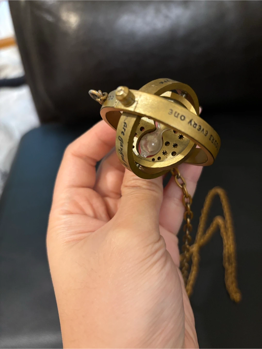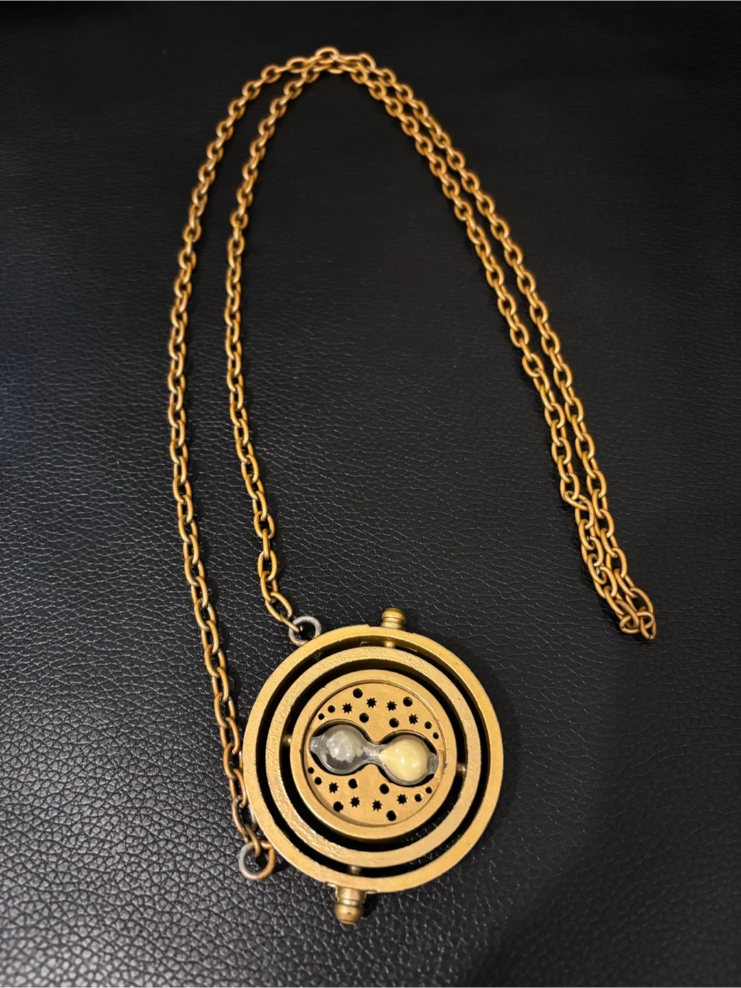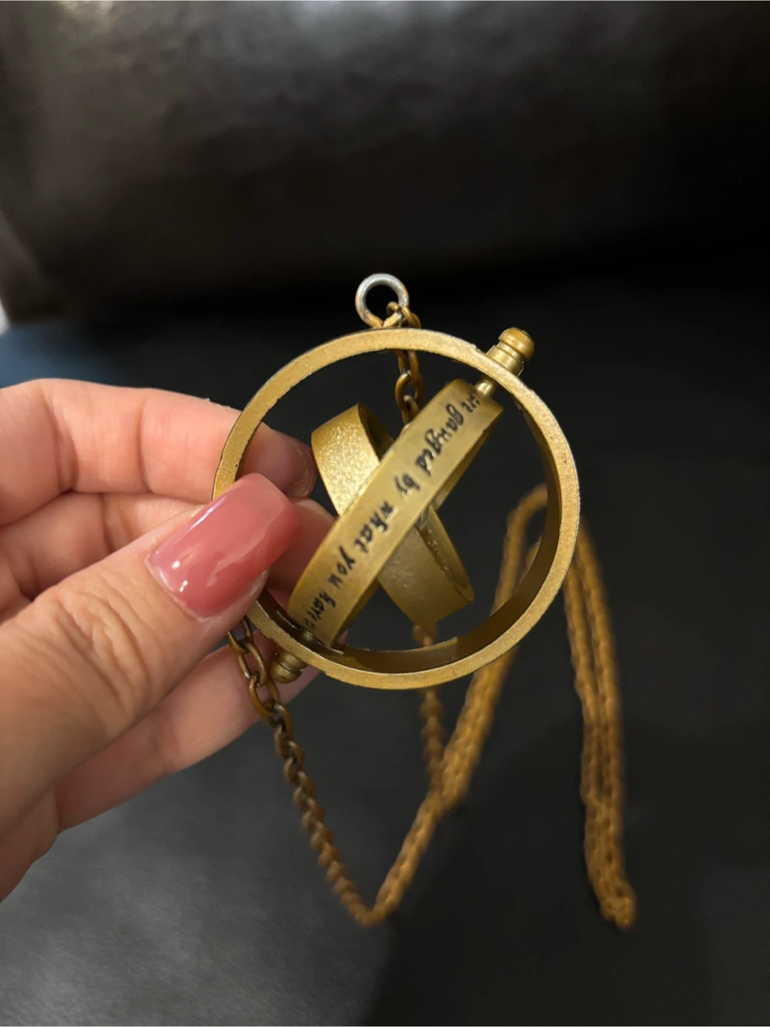 This gold Time Turner necklace features a spinning hourglass and engraved quotes. It's a classic replica accessory.