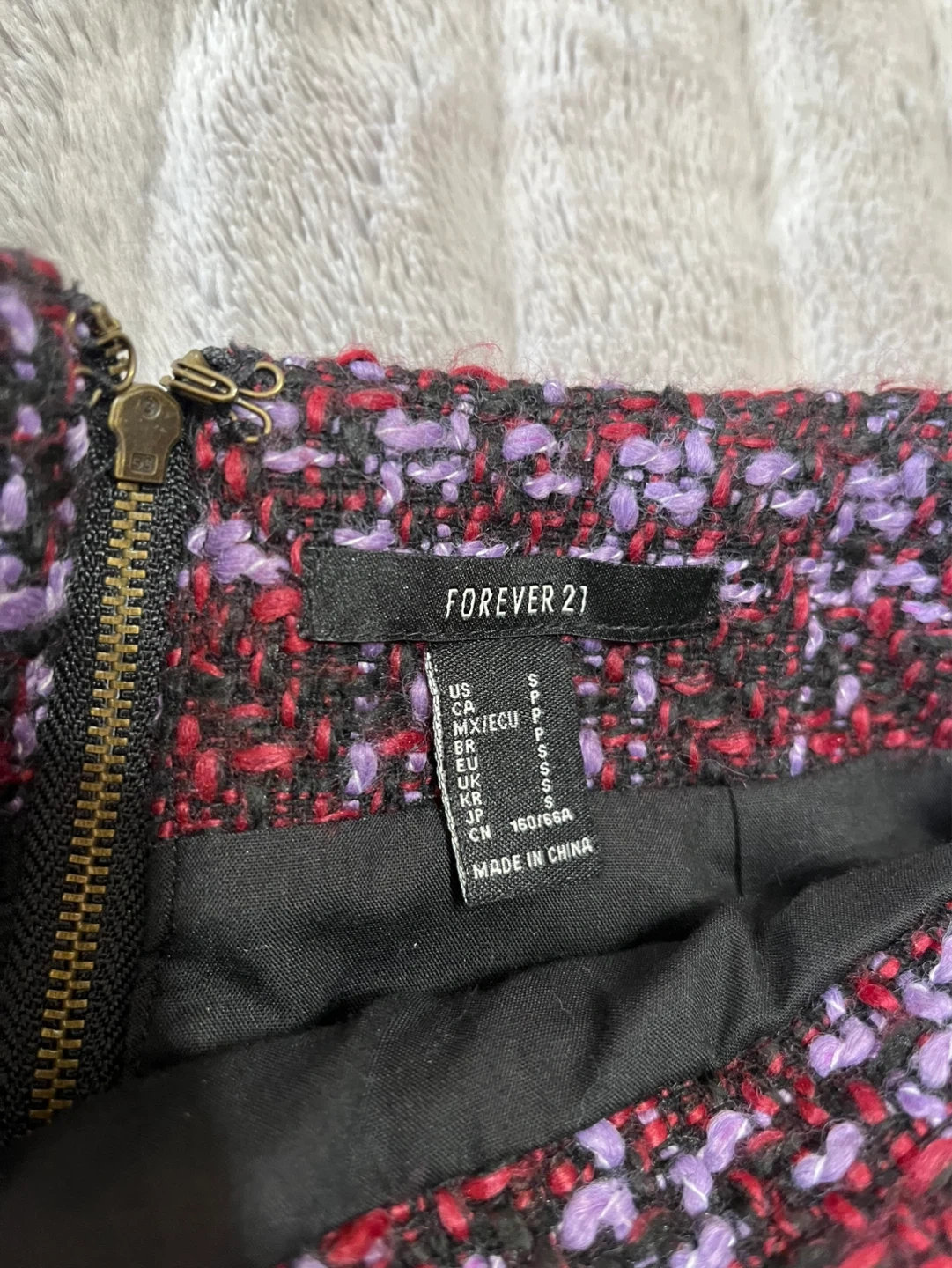 This tweed mini skirt features a red, purple, and black plaid pattern. It has a zippered back closure and decorative buttons on the front. Size S. Very short and fitted.
