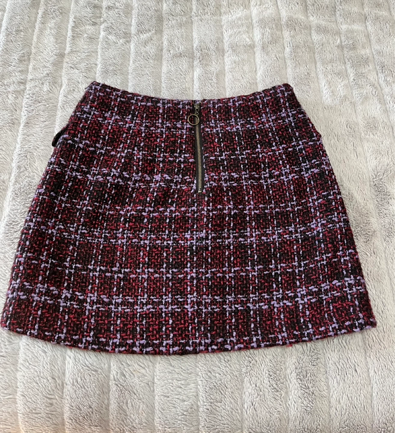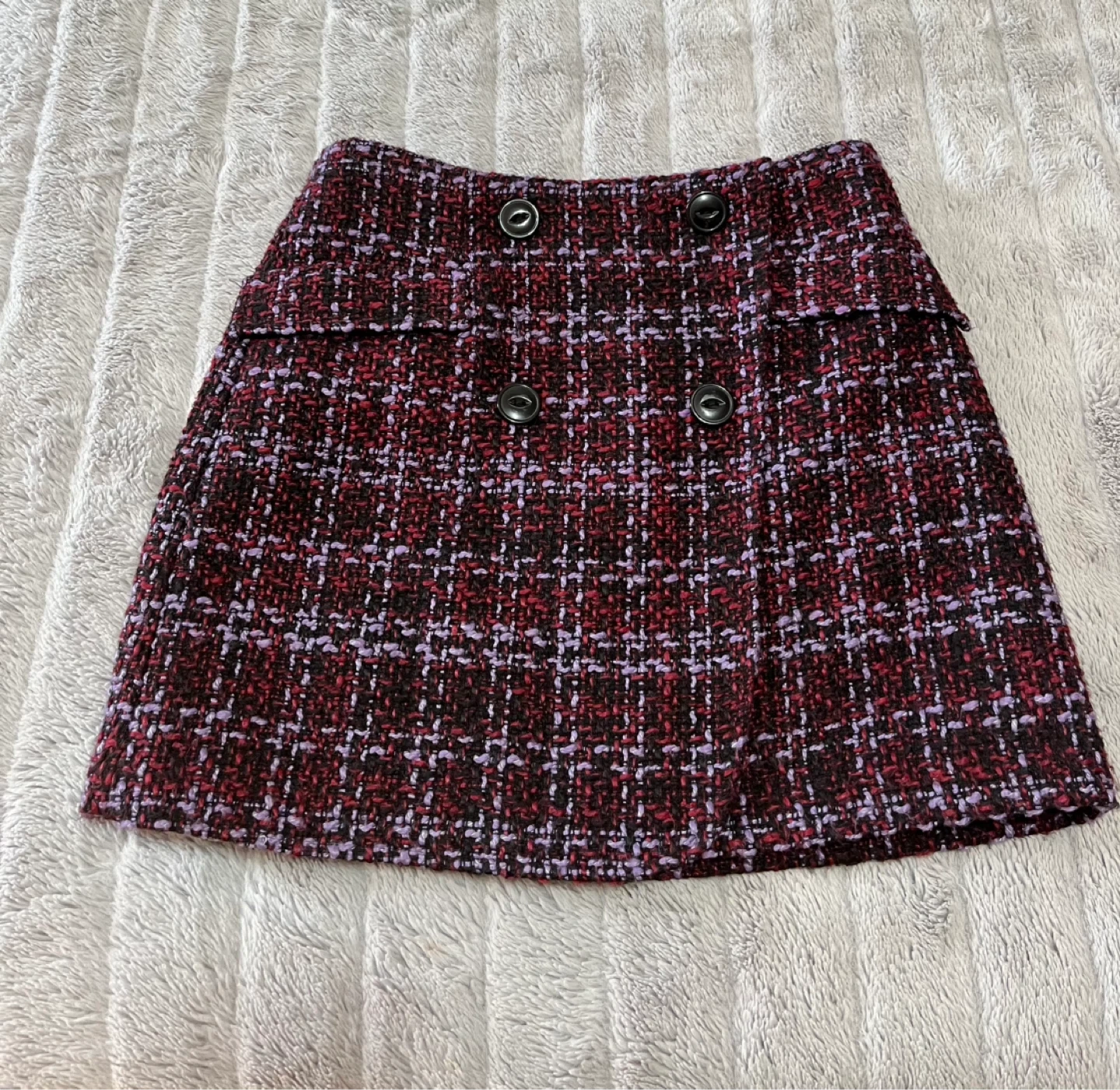 This tweed mini skirt features a red, purple, and black plaid pattern. It has a zippered back closure and decorative buttons on the front. Size S. Very short and fitted.