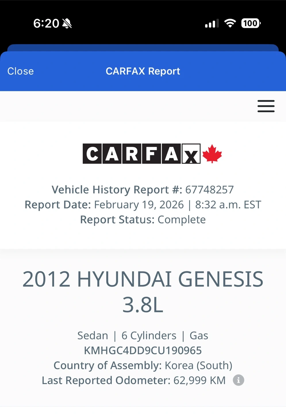 This is a 2012 Hyundai Genesis sedan with a 3.8L V6 engine.
