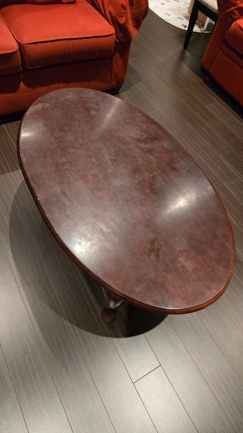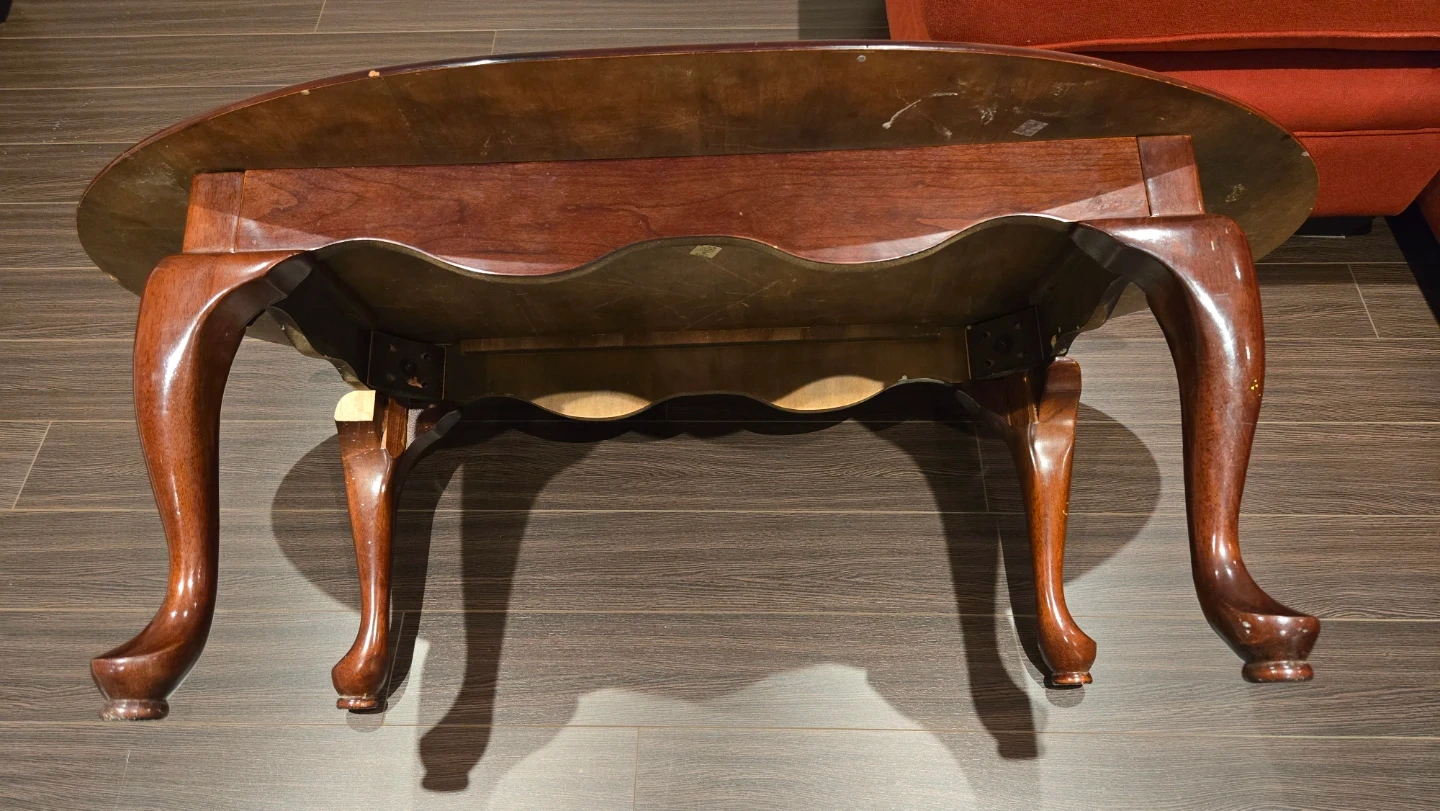 This is an oval coffee table from The Bombay Company. It's made of wood with classic cabriole legs. This table is a nice size for a living room.