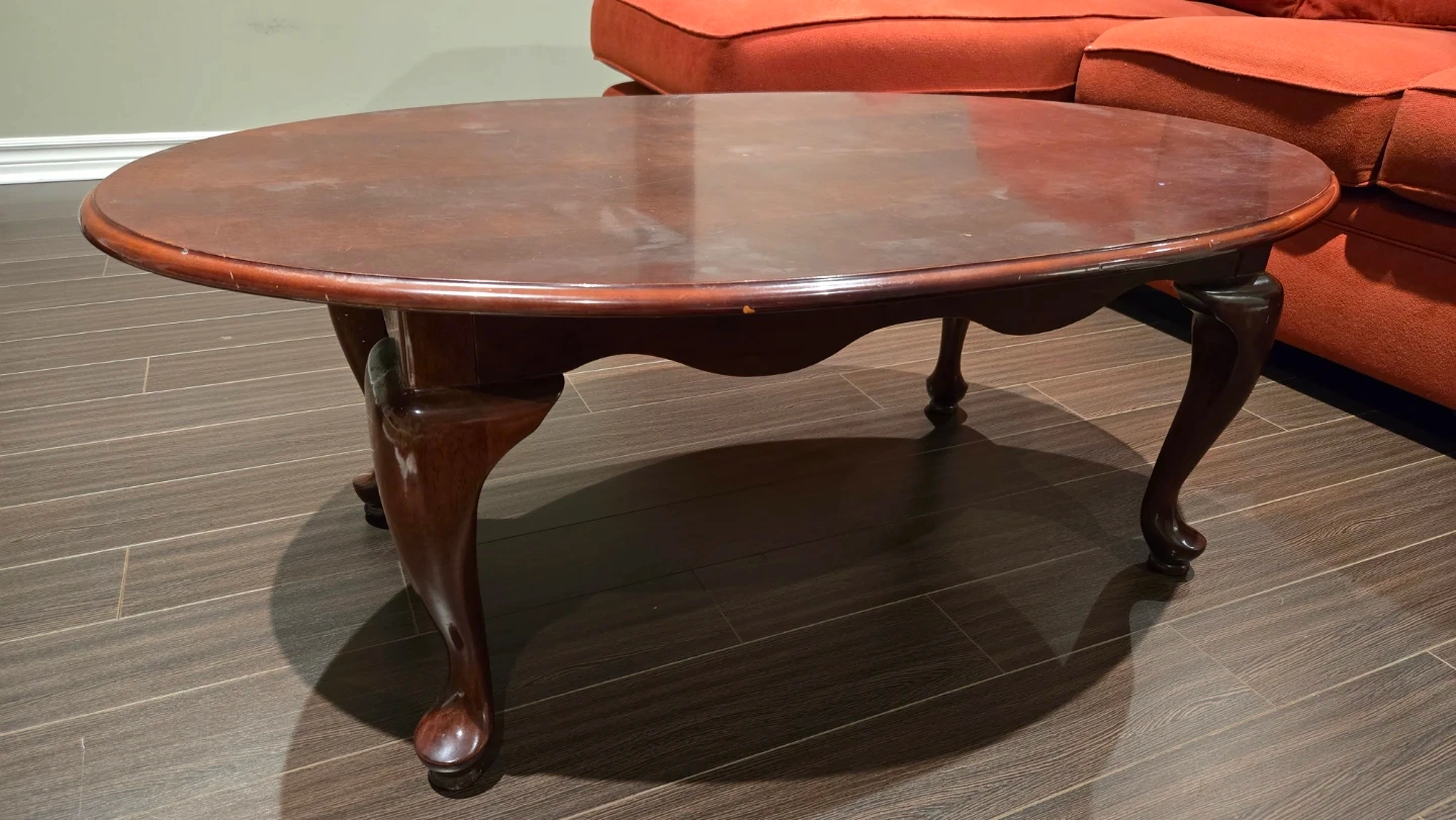 This is an oval coffee table from The Bombay Company. It's made of wood with classic cabriole legs. This table is a nice size for a living room.