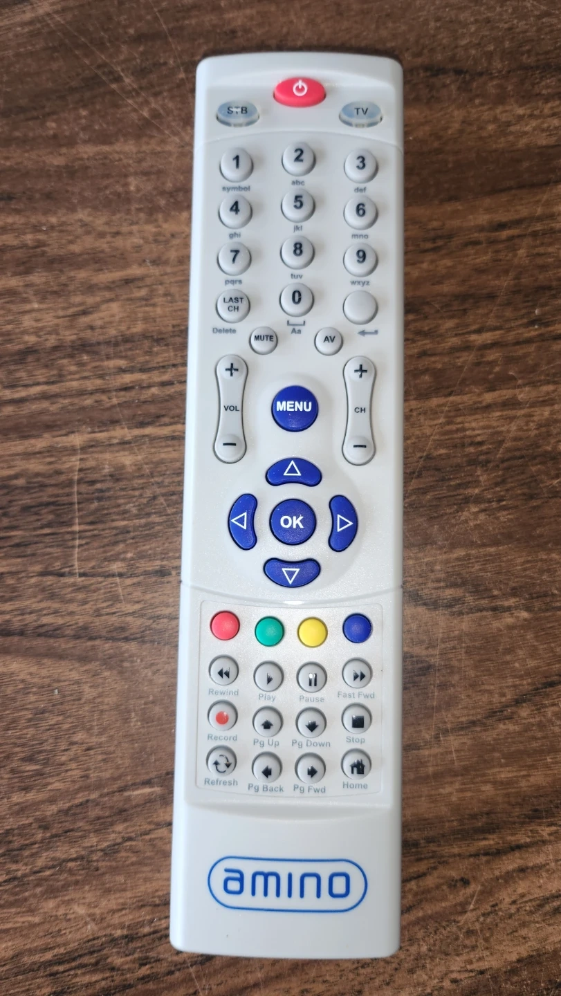 This is an Amino brand remote control for a TV or set-top box. It features a full numeric keypad, menu navigation, playback controls, and volume/channel adjustments. Includes a power button, STB button, and TV button.