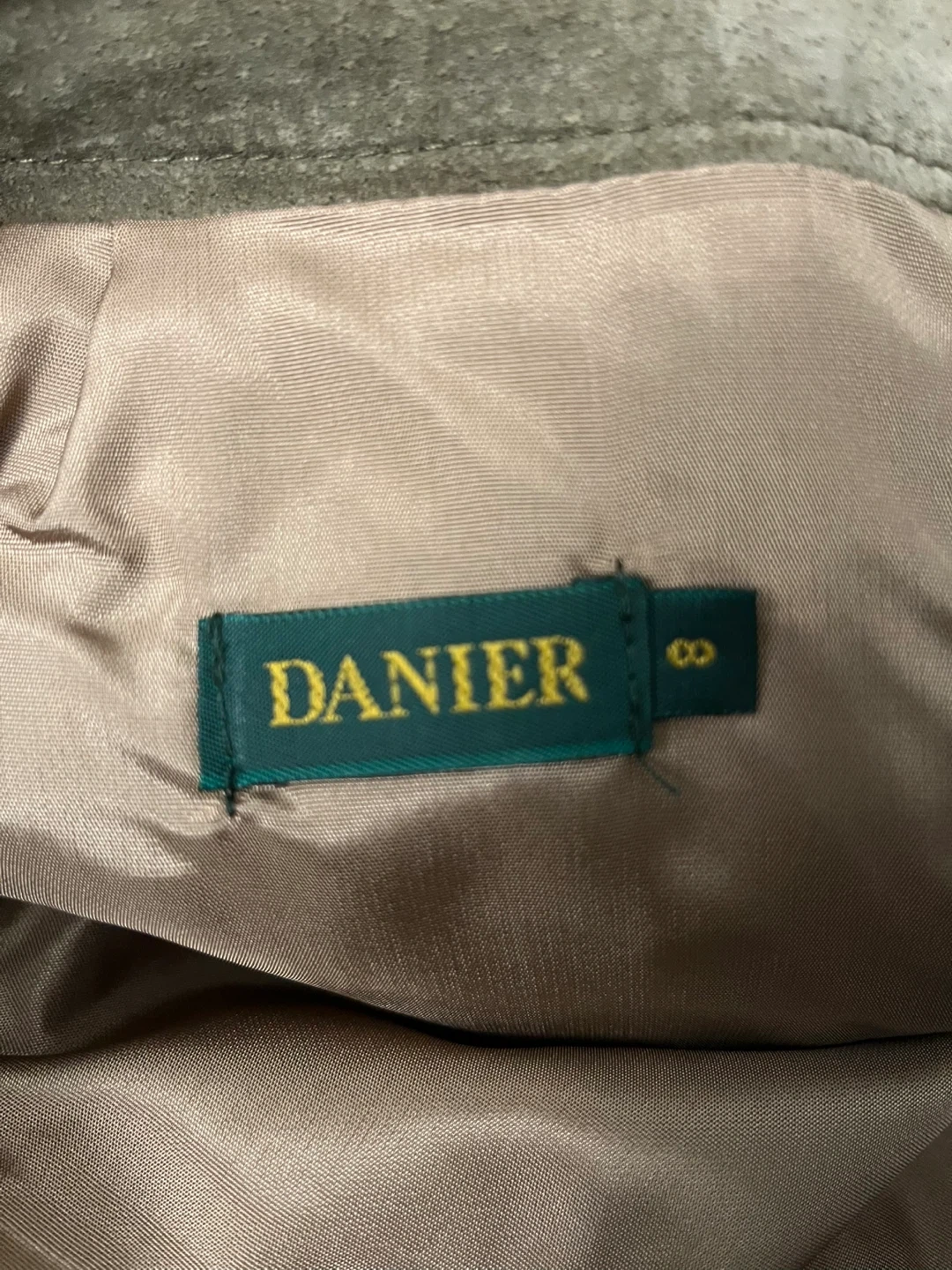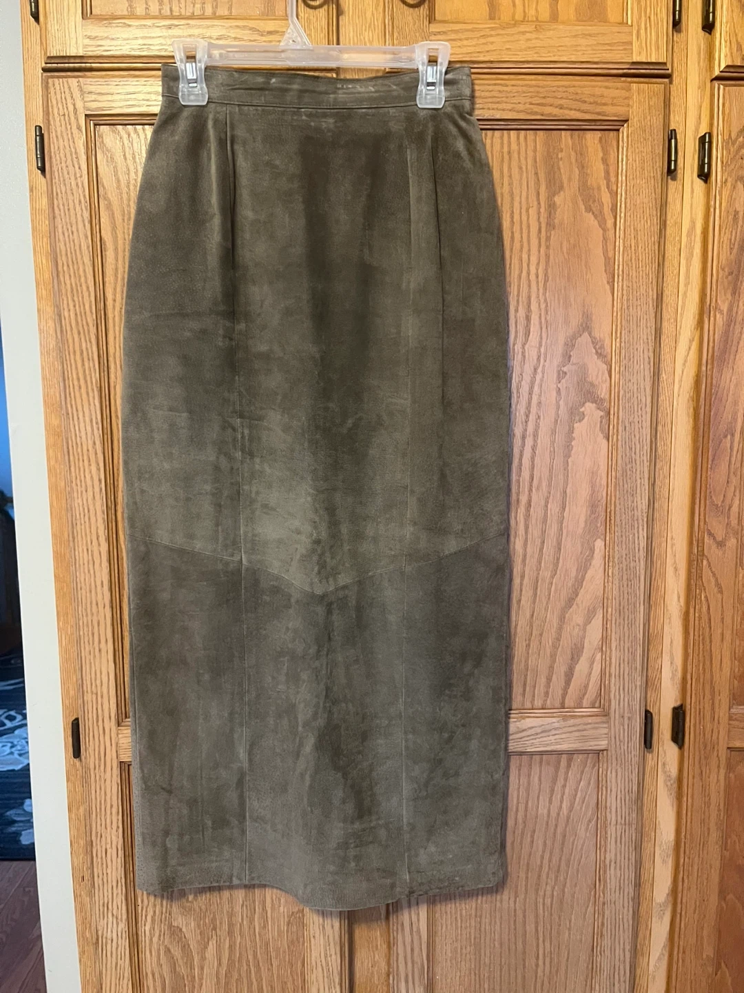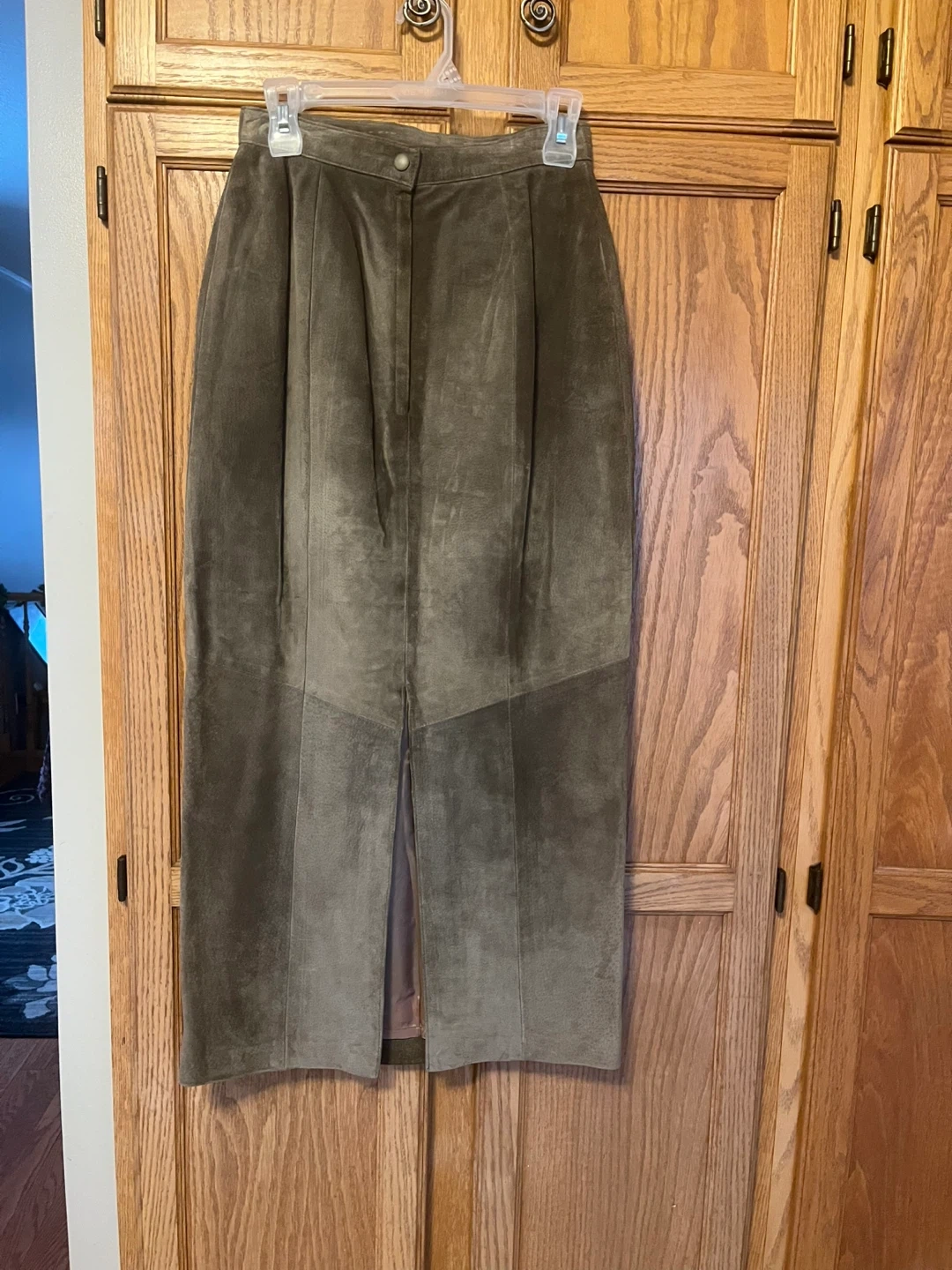 This is a Danier suede maxi skirt in a size 8. It's a timeless olive green colour. The skirt features a smooth lining and a front slit for ease of movement. A classic piece for any wardrobe!