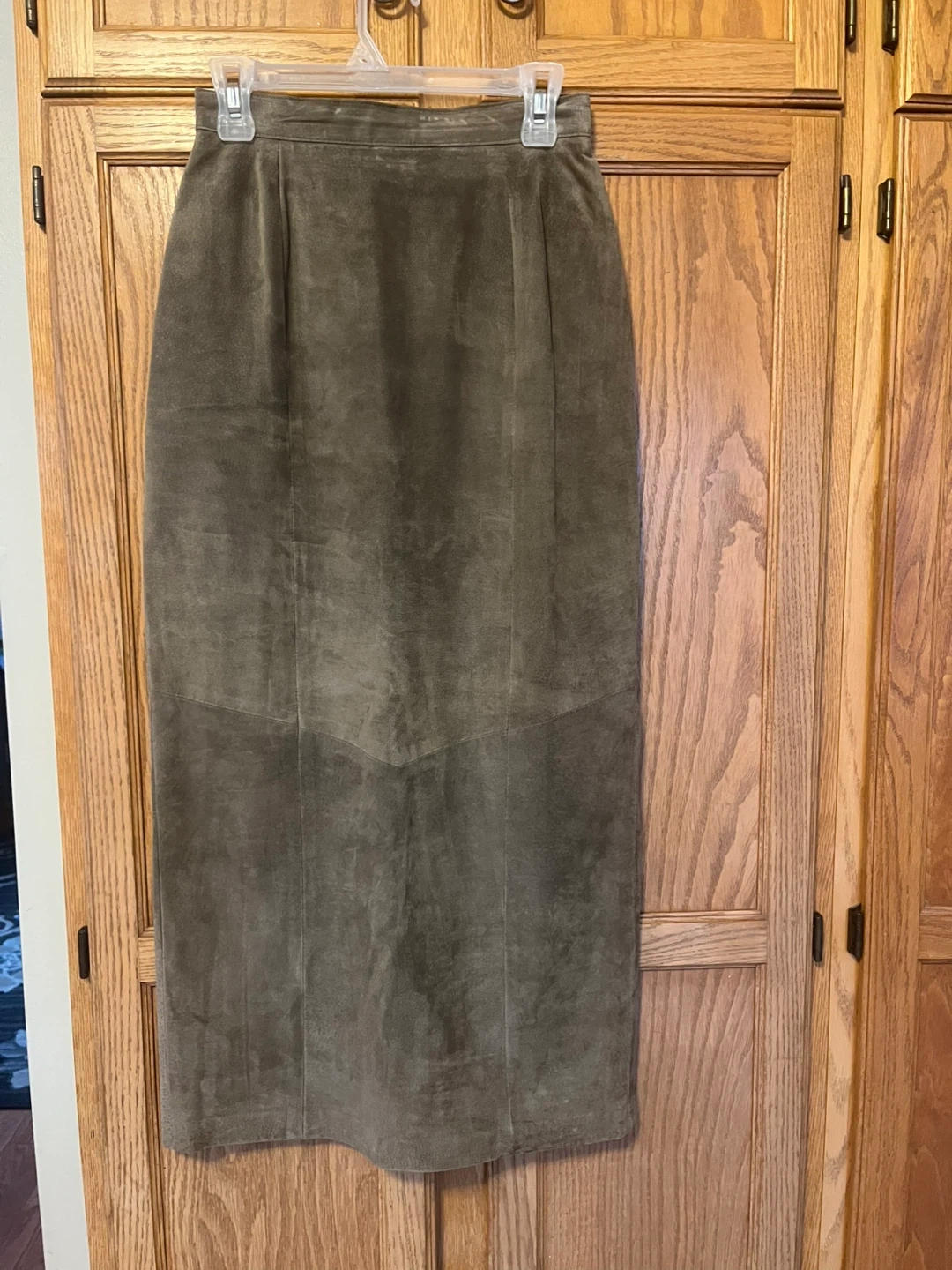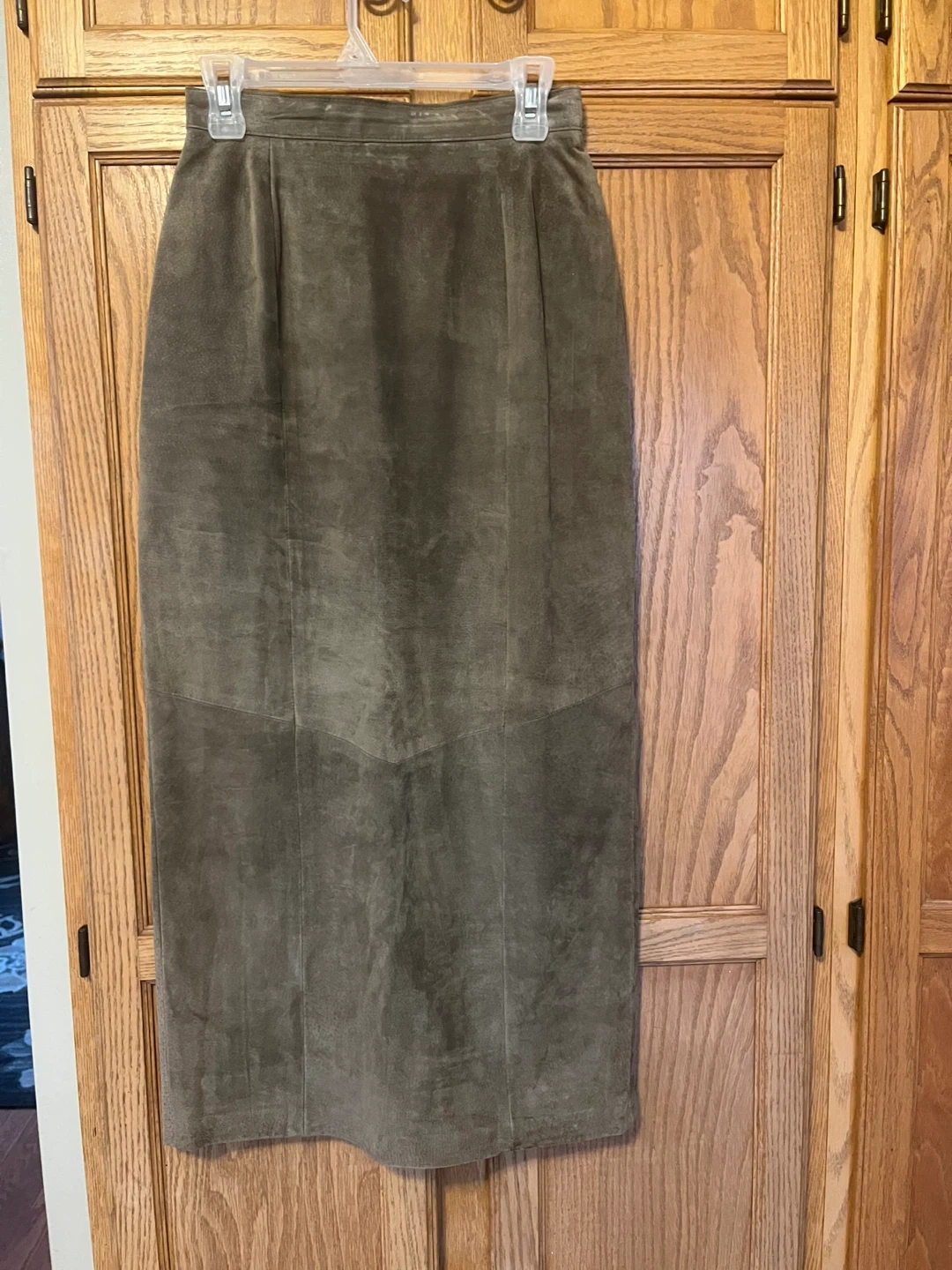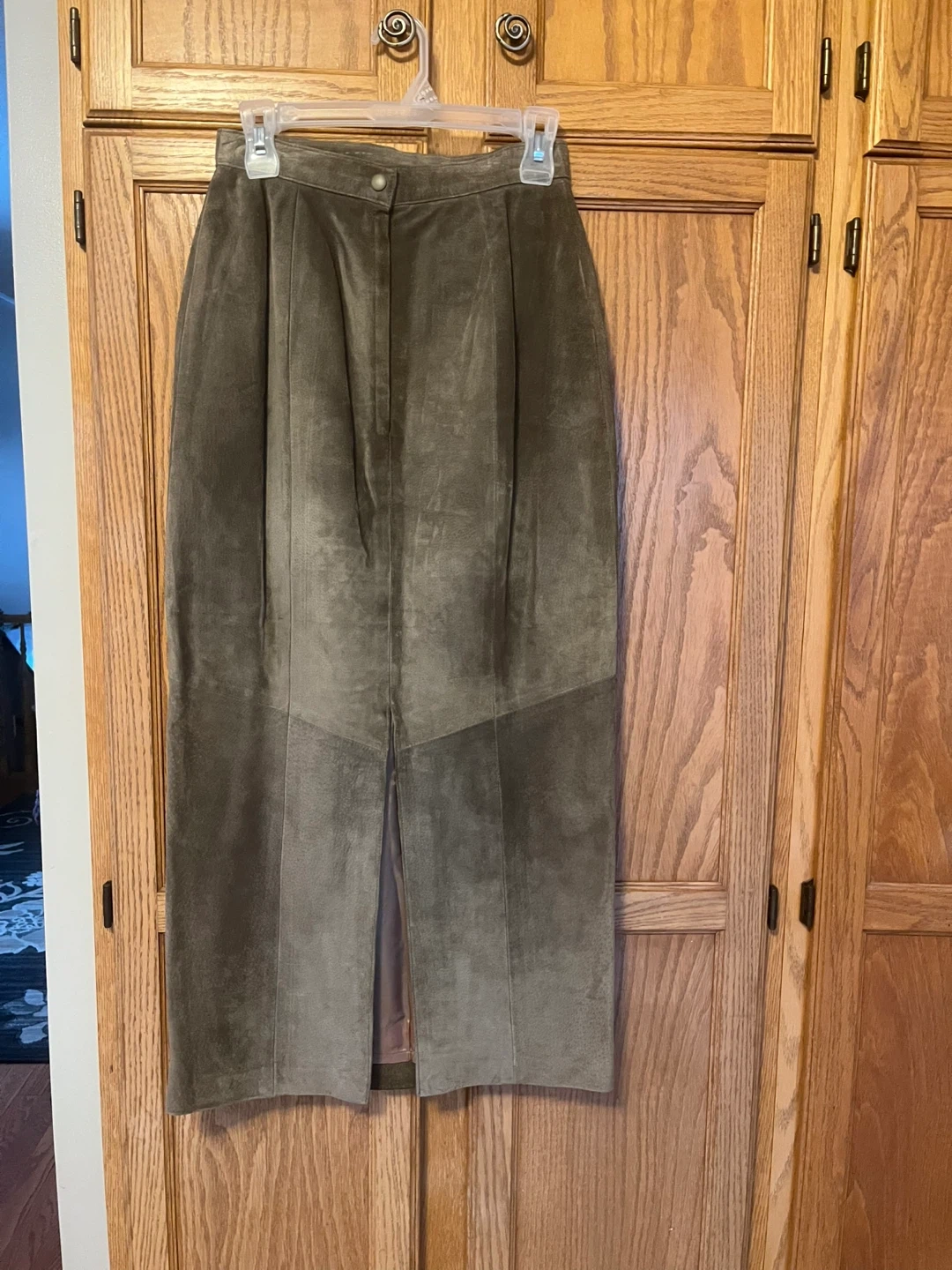 This is a Danier suede maxi skirt in a size 8. It's a timeless olive green colour. The skirt features a smooth lining and a front slit for ease of movement. A classic piece for any wardrobe!