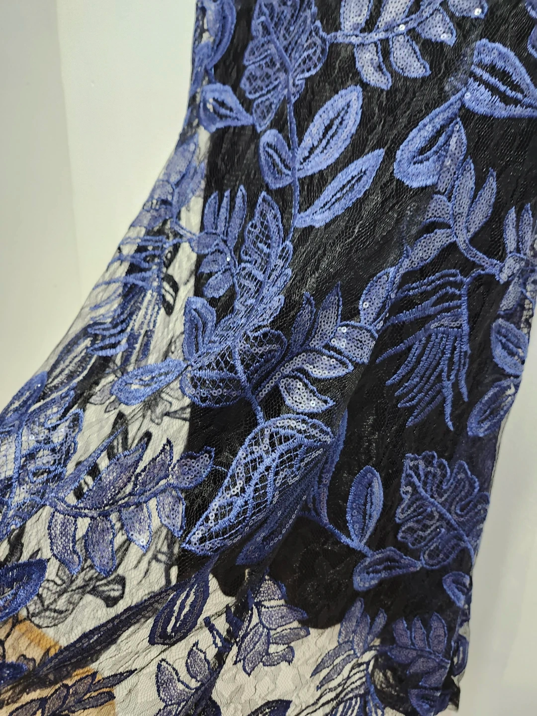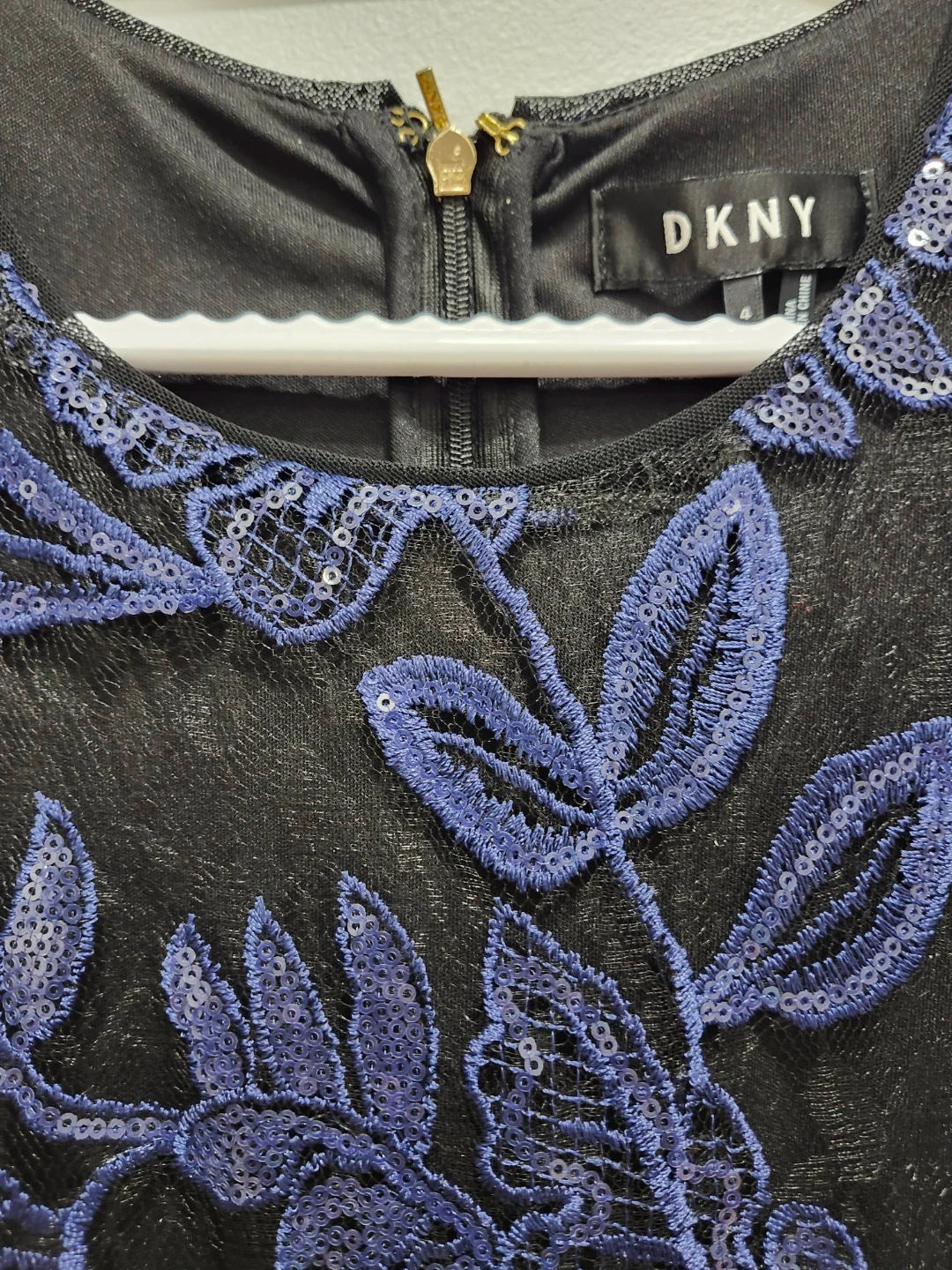 DKNY sleeveless dress with black lace overlay. Features blue floral embroidery and sequins. Zipper closure at back. Size is 4.