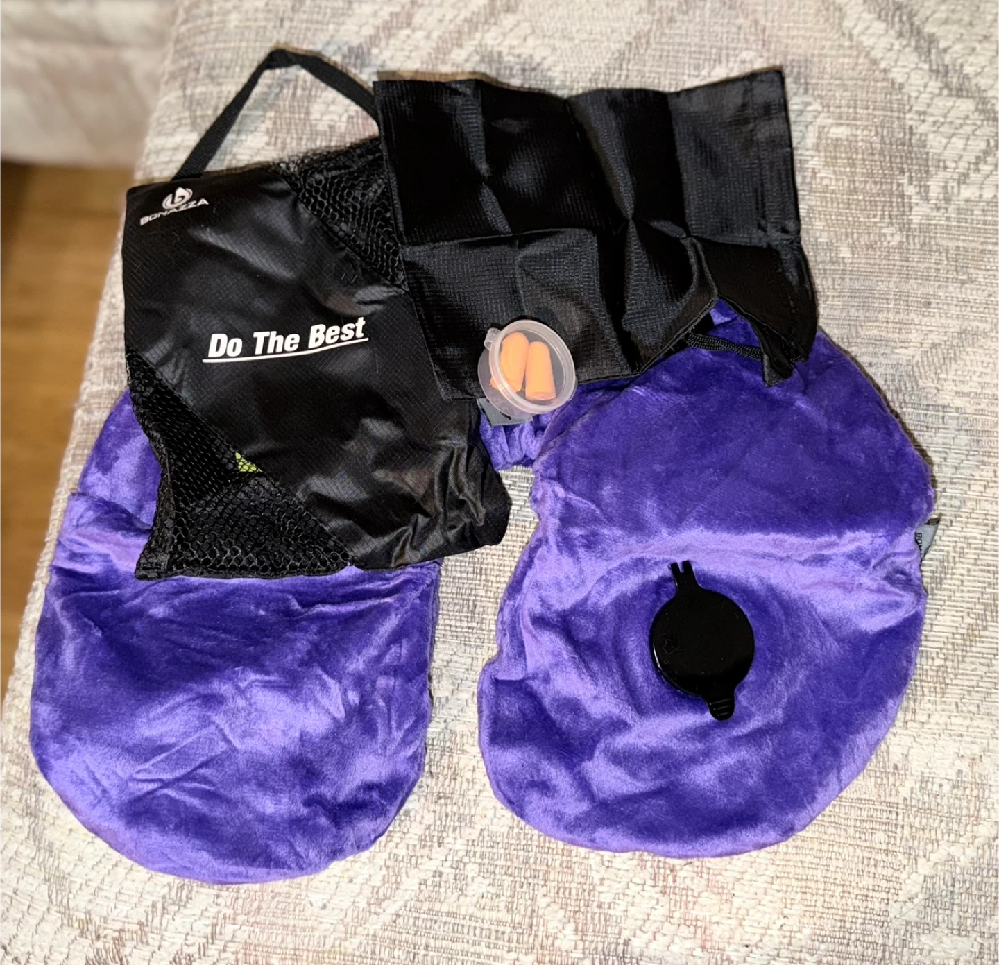 BONAZZA iTP Travel Inflatable Pillow with earplugs and storage bag - 2 Sec Fully Inflates Customize Comfort Travel Neck Pillow Easy to Use and Carry, Washable, Compact, Portable U-Shape Neck Travel Pillow (Purple)