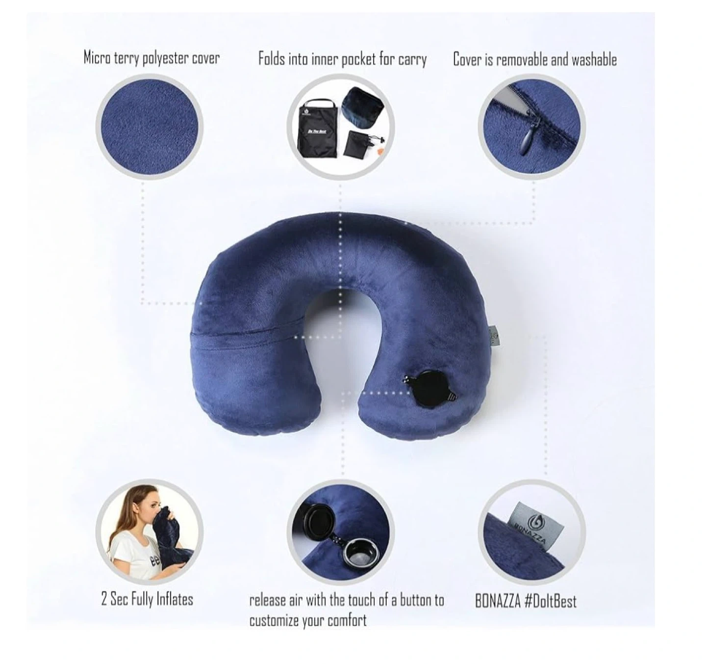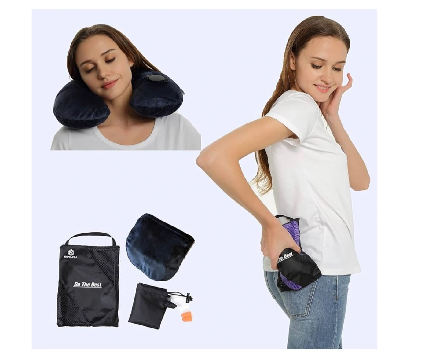 BONAZZA iTP Travel Inflatable Pillow with earplugs and storage bag - 2 Sec Fully Inflates Customize Comfort Travel Neck Pillow Easy to Use and Carry, Washable, Compact, Portable U-Shape Neck Travel Pillow (Purple)