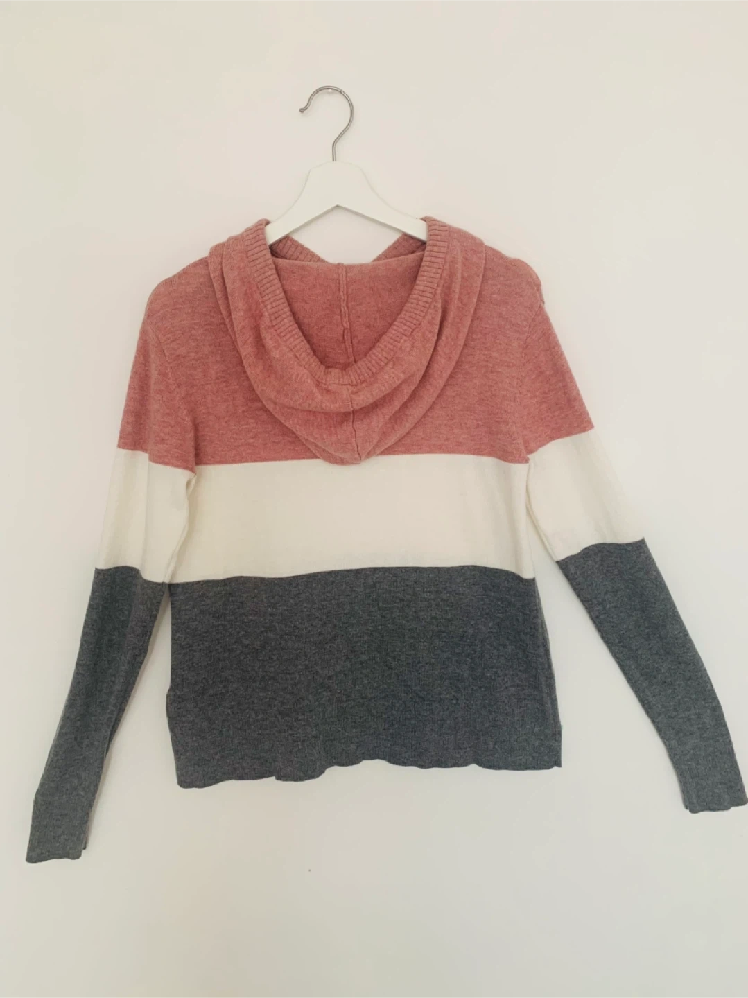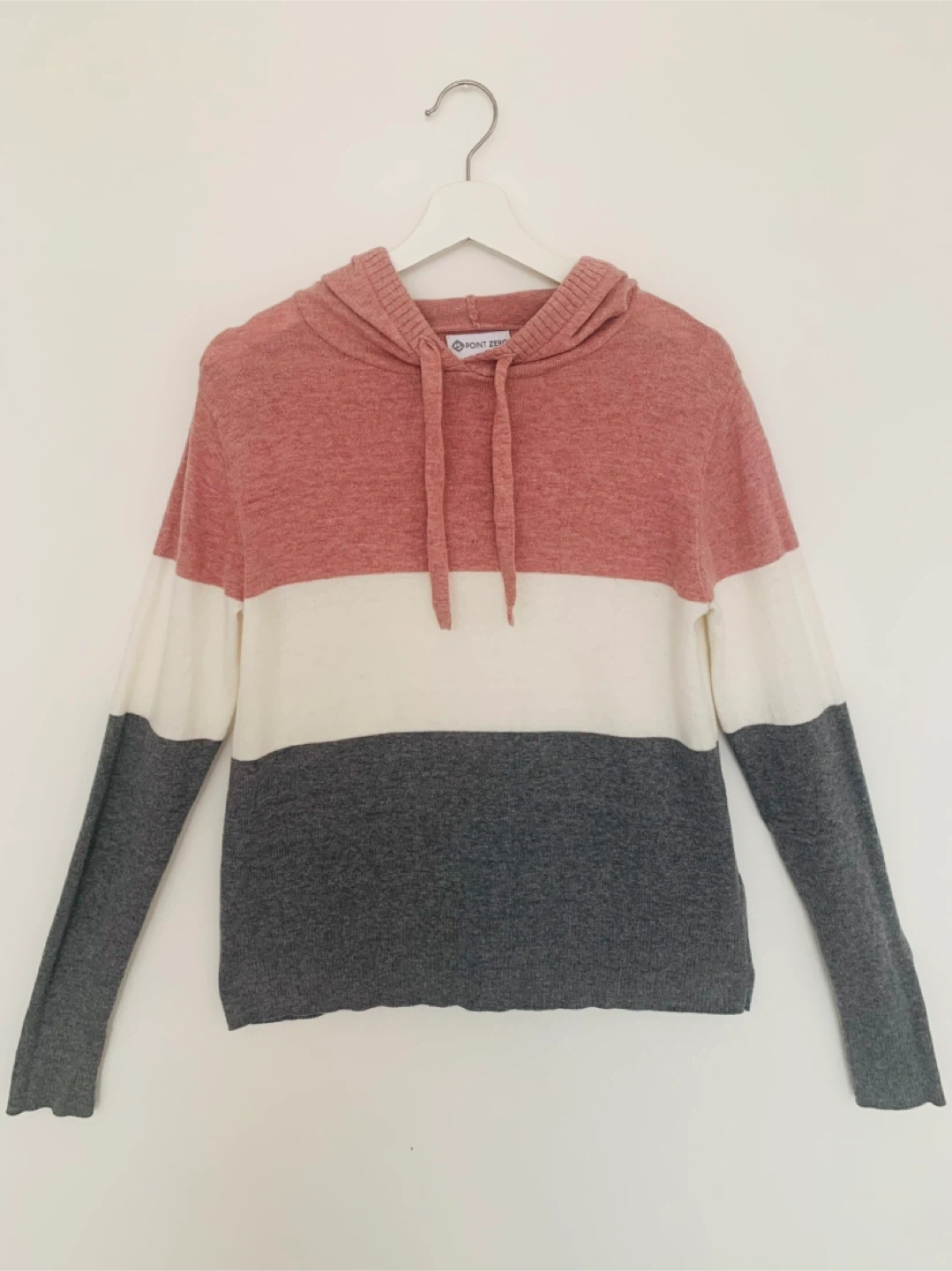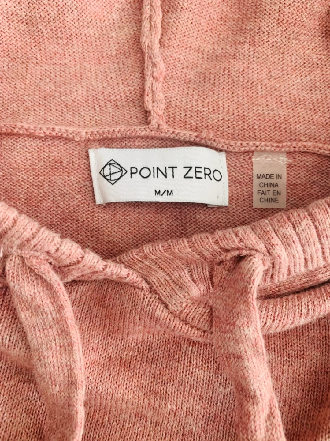 This Point Zero hoodie is size M/M. It's made with a blend of 50% cotton, 45% nylon, and 5% wool. The sweater features a colour block design with pink, white, and grey sections.