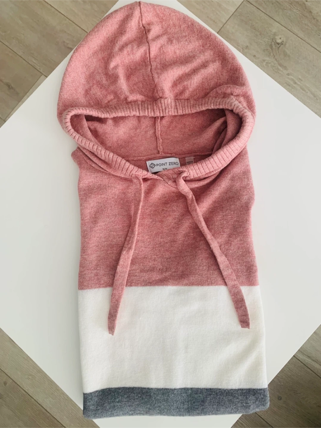 This Point Zero hoodie is size M/M. It's made with a blend of 50% cotton, 45% nylon, and 5% wool. The sweater features a colour block design with pink, white, and grey sections.