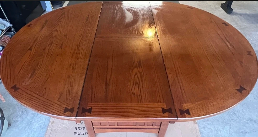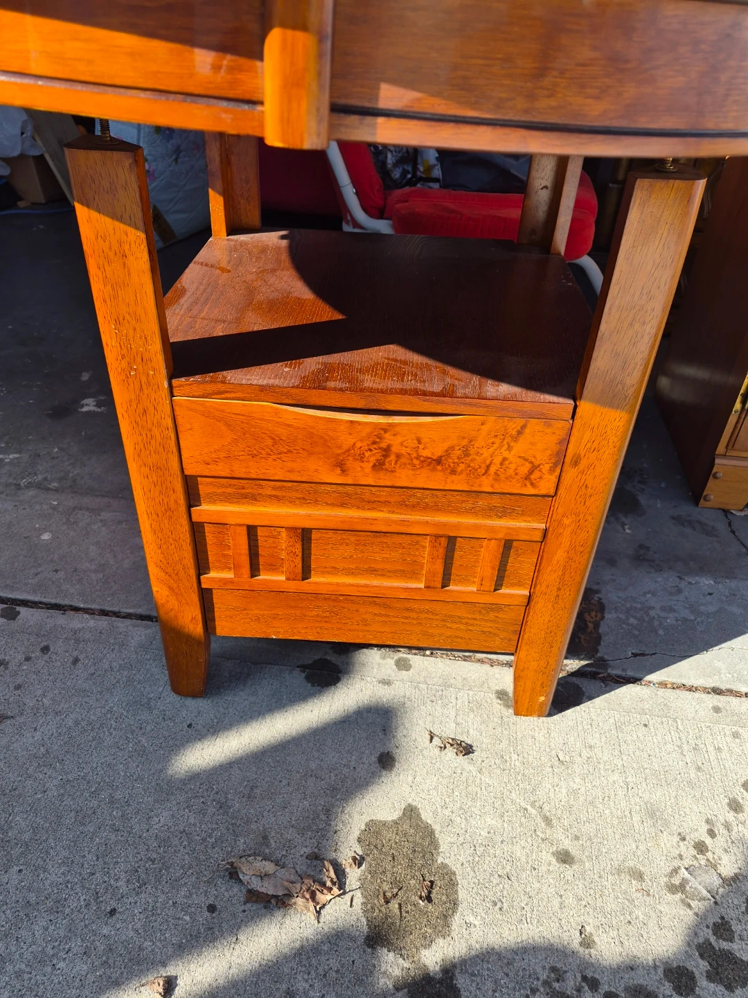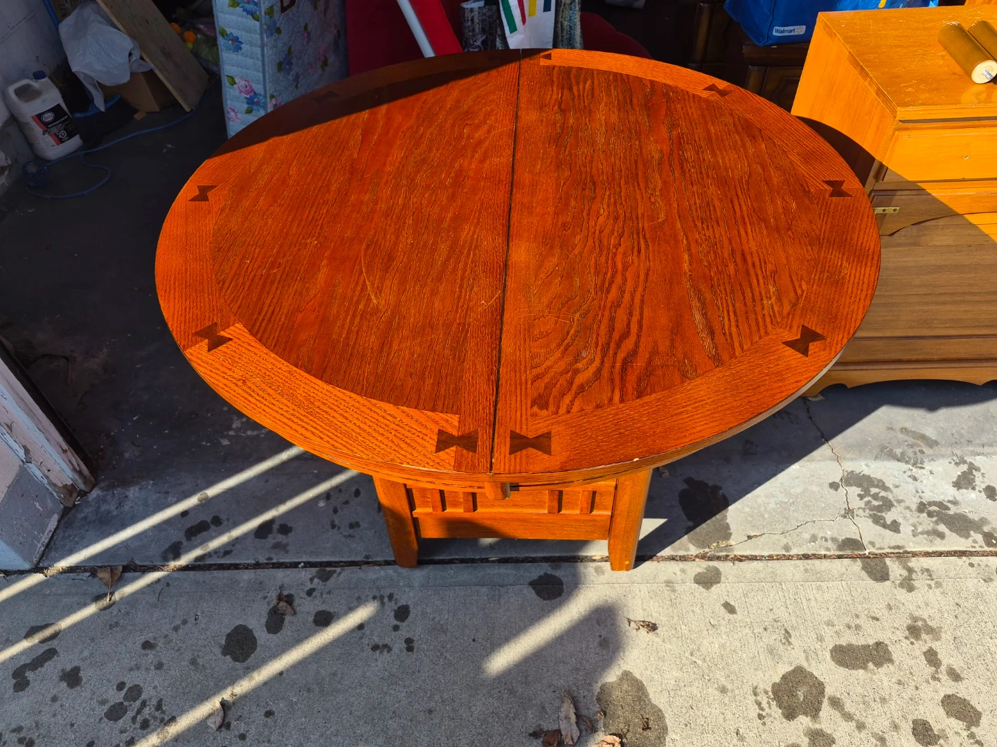 A beautiful solid oak dining table with a rich, warm finish. It features a decorative inlaid wood border and a convenient drawer for storage. This table's versatile design makes it suitable for smaller spaces or for expanding seating when needed.