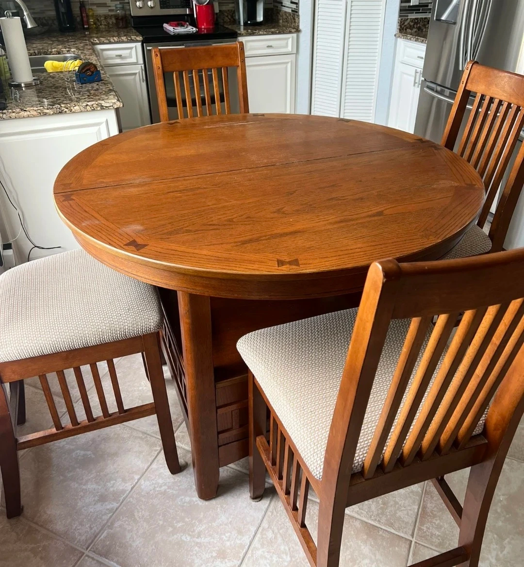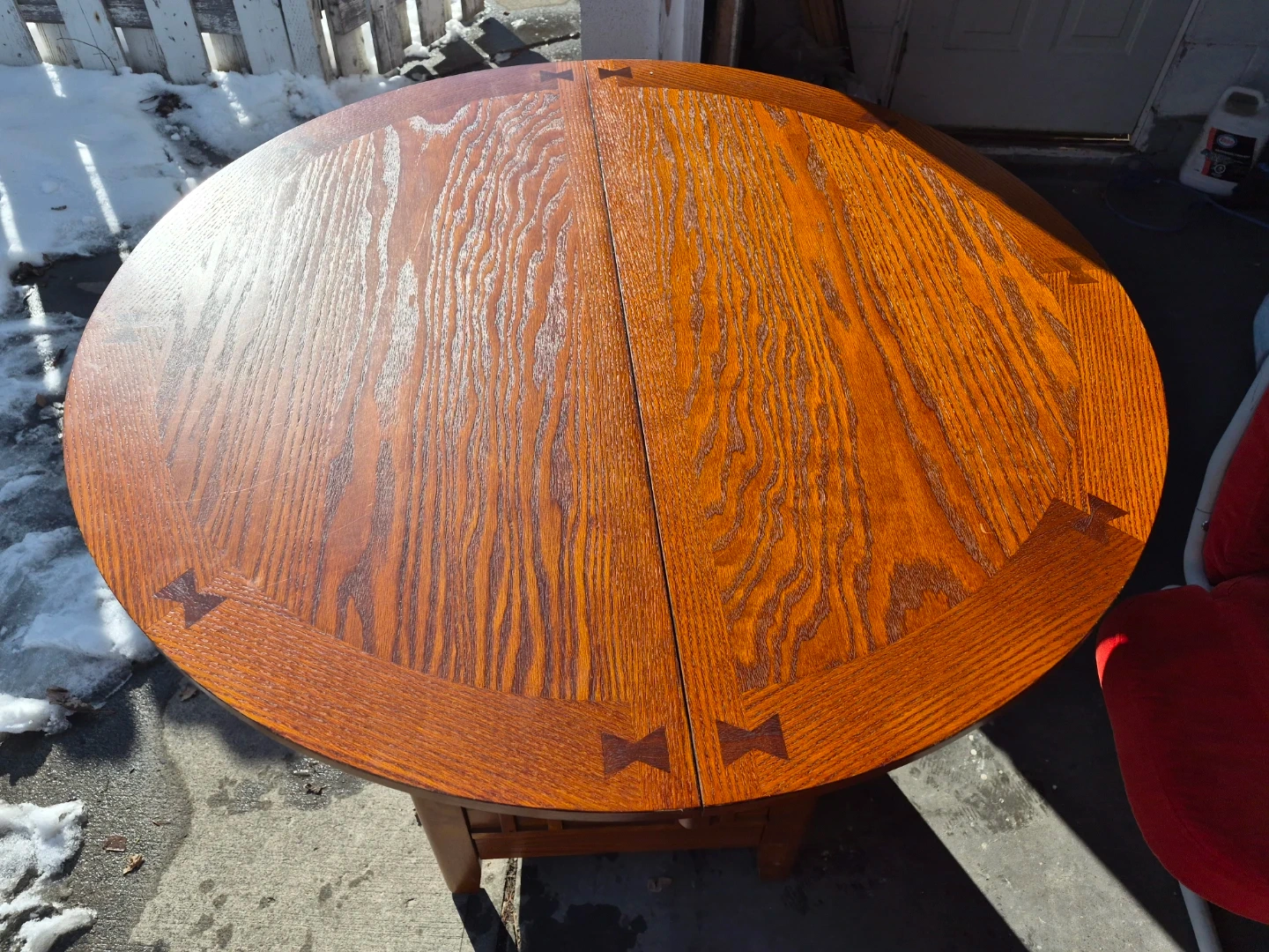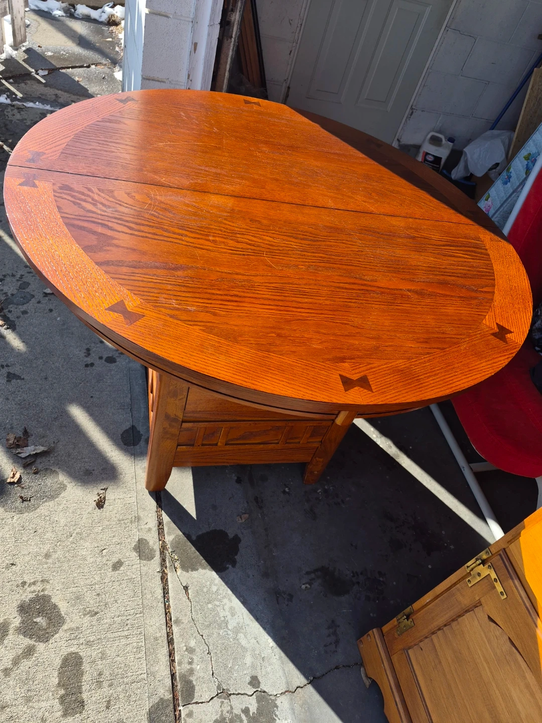 A beautiful solid oak dining table with a rich, warm finish. It features a decorative inlaid wood border and a convenient drawer for storage. This table's versatile design makes it suitable for smaller spaces or for expanding seating when needed.