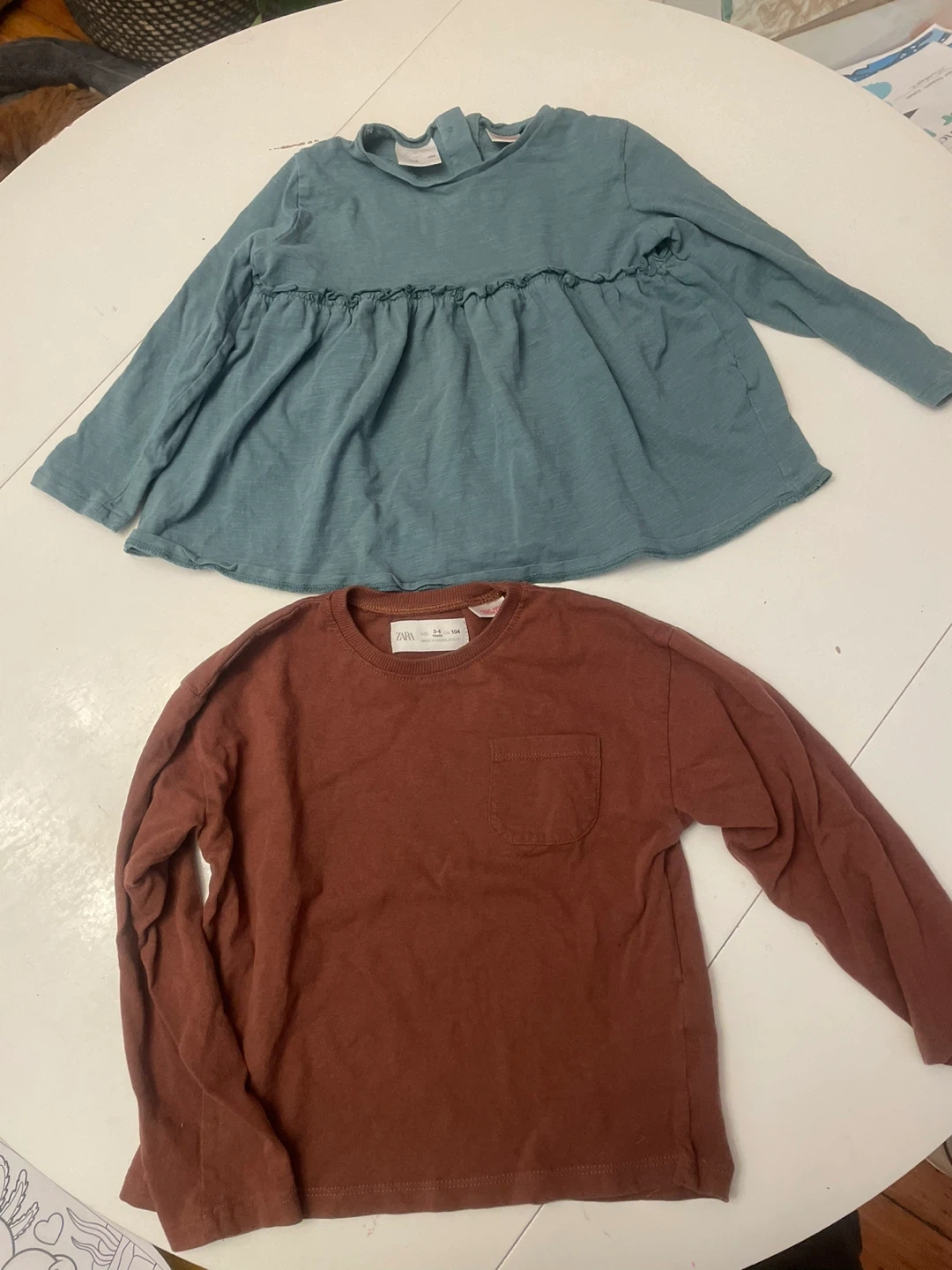 Two long sleeve tops from Zara Baby. One in teal with a ruffled detail and the other in rust with a chest pocket. Both are size 3-4 years, which corresponds to 104cm.