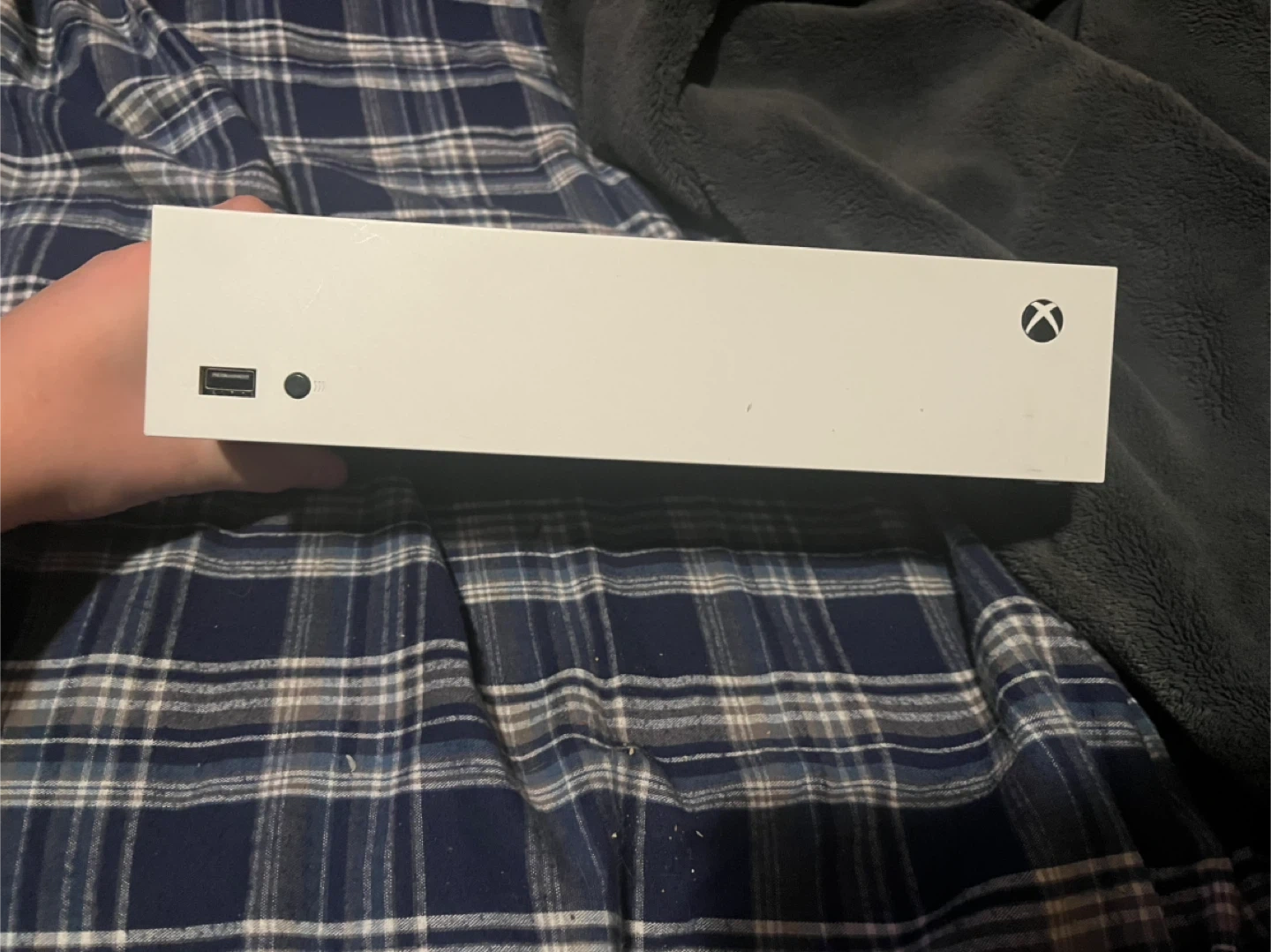 It's a white Xbox Series S gaming console. It has a USB port and a power button on the front. It features multiple ports on the back for connectivity. This console is great for playing games.