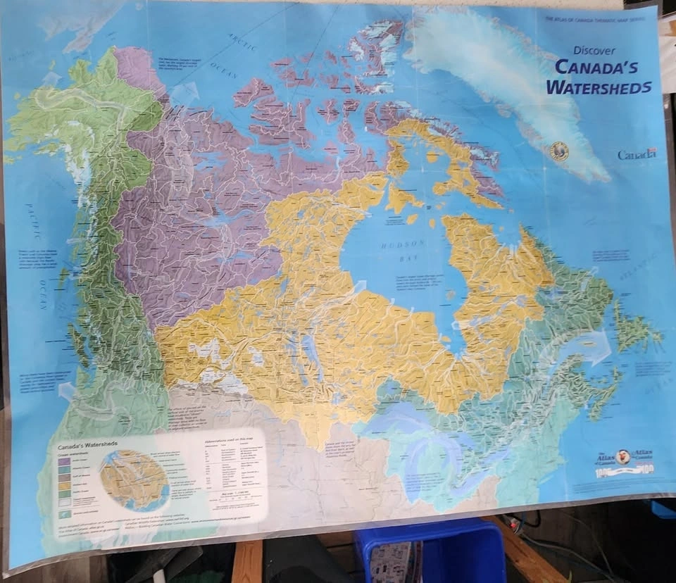 This map shows the major ocean watersheds of Canada, illustrating where all surface water across the country eventually drains. Produced by Natural Resources Canada and the Canadian Wildlife Federation, it depicts a hierarchy of 594 connected watersheds grouped into five massive ocean-draining landscapes. The map uses distinct colors to identify the five primary ocean drainage areas: Yellow for the Hudson Bay Watershed, Purple/Orange for the Arctic Ocean Watershed, Green for the Pacific Ocean Watershed, Light Blue/Cyan for the Atlantic Ocean Watershed, and Small Tan/Yellow for the Gulf of Mexico Watershed. The lower-left corner contains a detailed legend explaining these color codes and showing the hierarchy of sub-watersheds. These boundaries act as "drainage divides." Map details: Scale typically 1:4,000,000. Located in St. Catharines near Western Hill. Door/porch pick up and cash only.