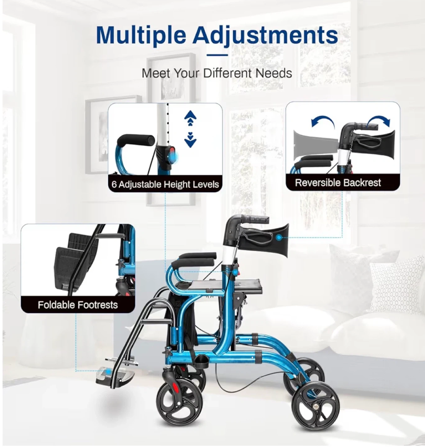 This walker features 6 adjustable height levels and a reversible backrest for customized comfort. It also includes foldable footrests and a seat with a bag for convenience. It's designed for mobility assistance, offering support and ease of use.