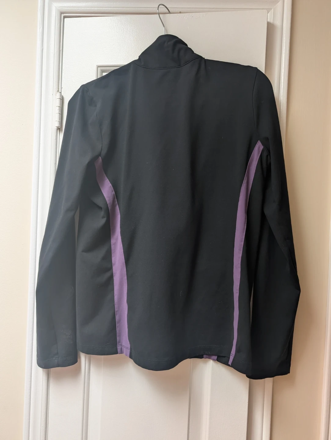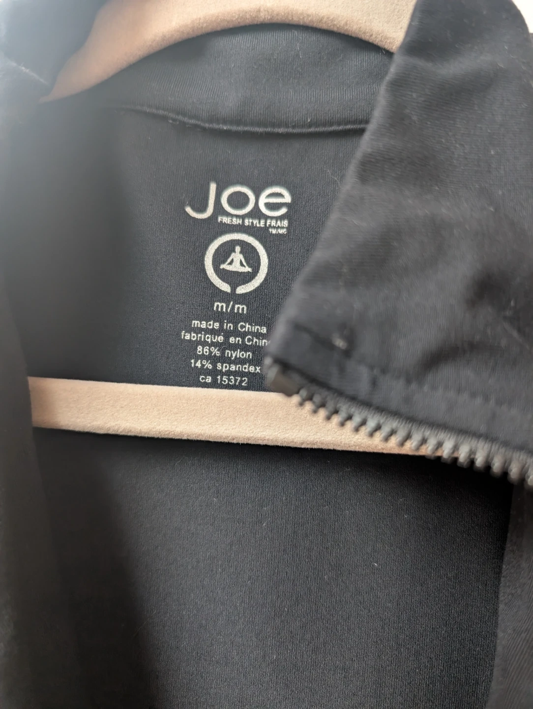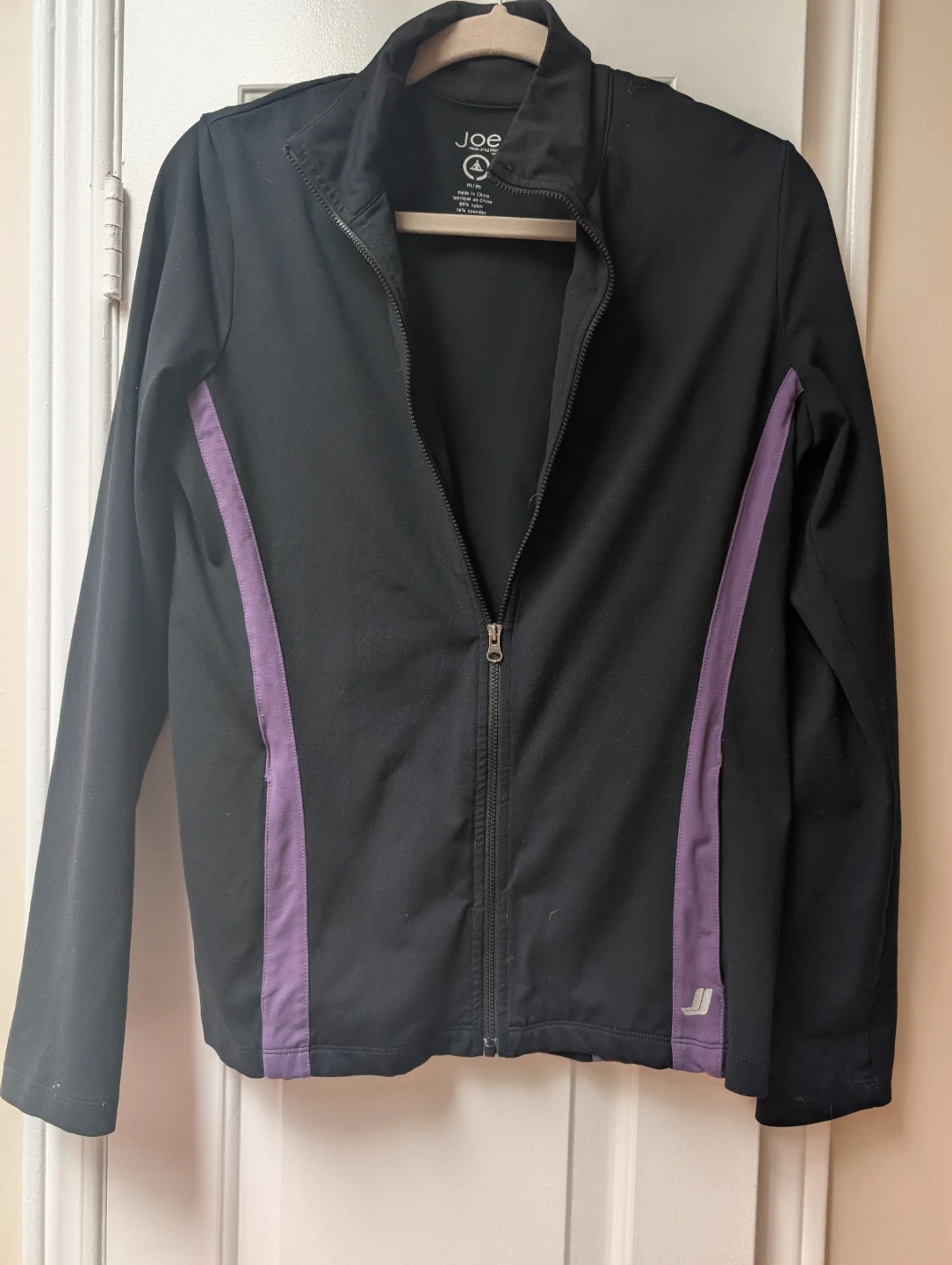 This Joe Fresh jacket is black with purple sidings. Size M. A great layering piece for cooler weather!