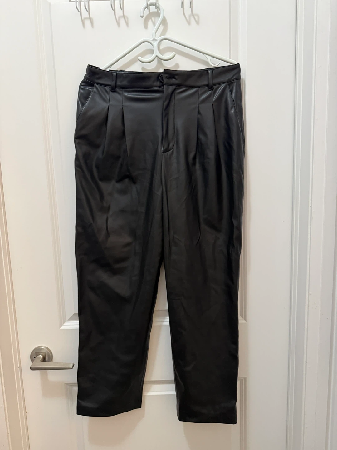 These black faux leather pants from Zara feature a pleated front and a classic button and zip closure. They're made in Morocco and are a size S (EUR 36, US 4, MEX 26). Perfect for a stylish outfit!
