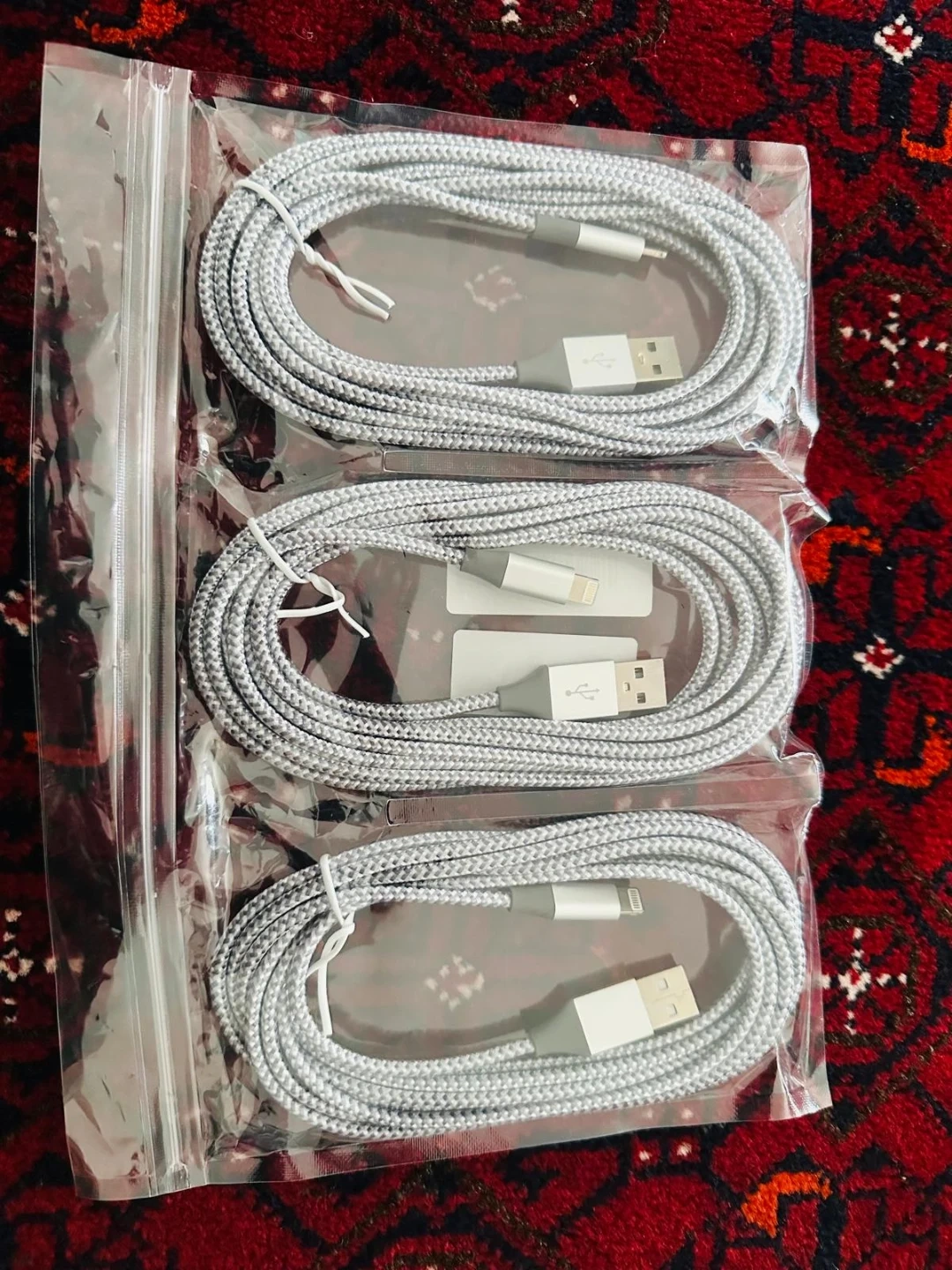 Three braided silver Lightning to USB cables included. They're compatible with Apple devices. These cables are designed for charging and data transfer.