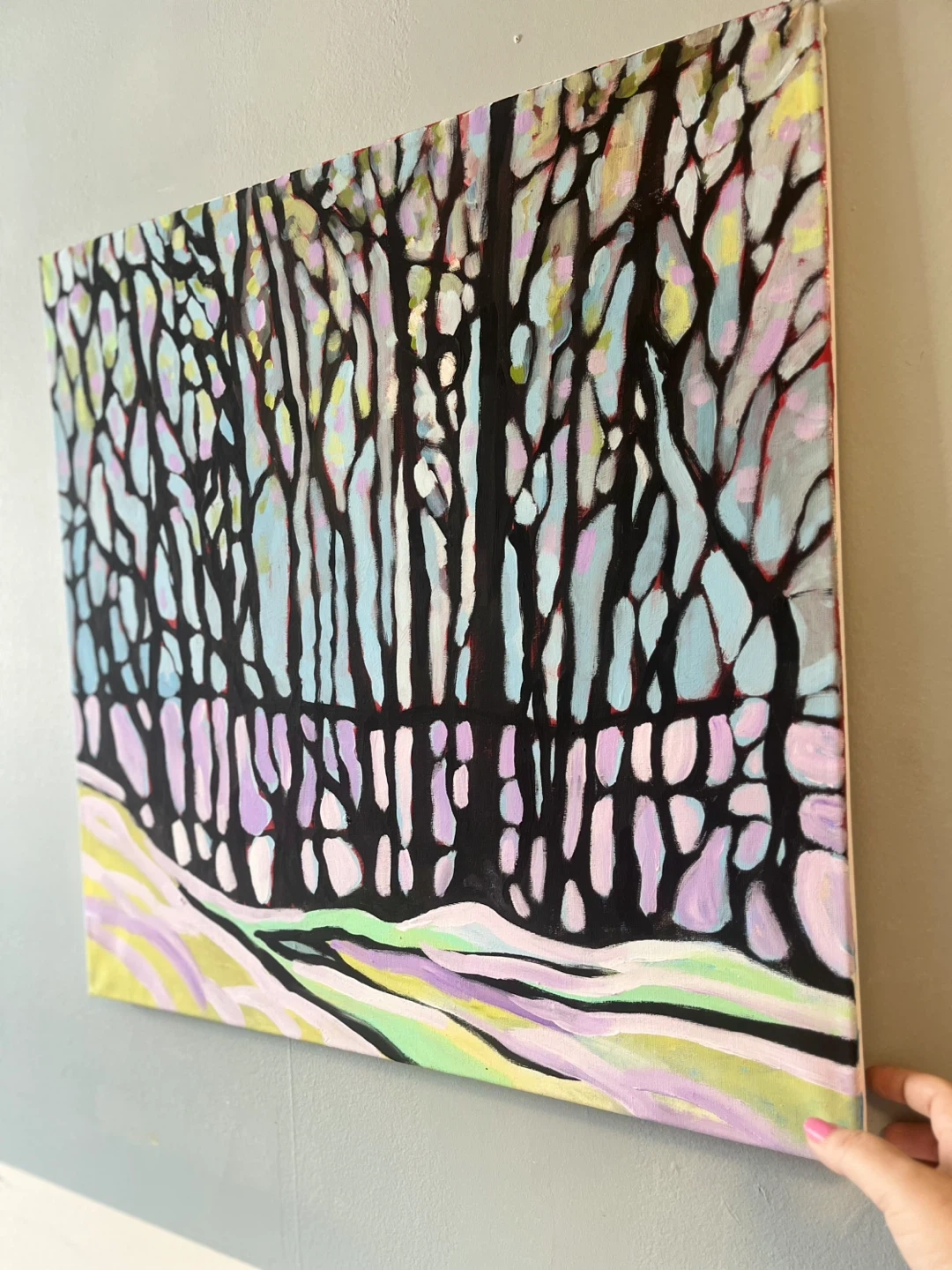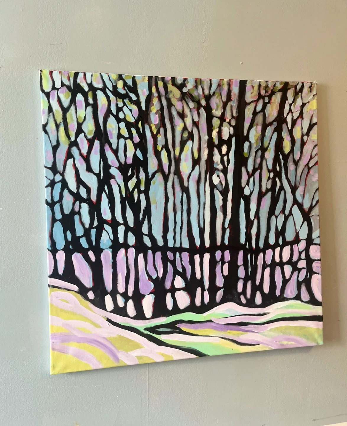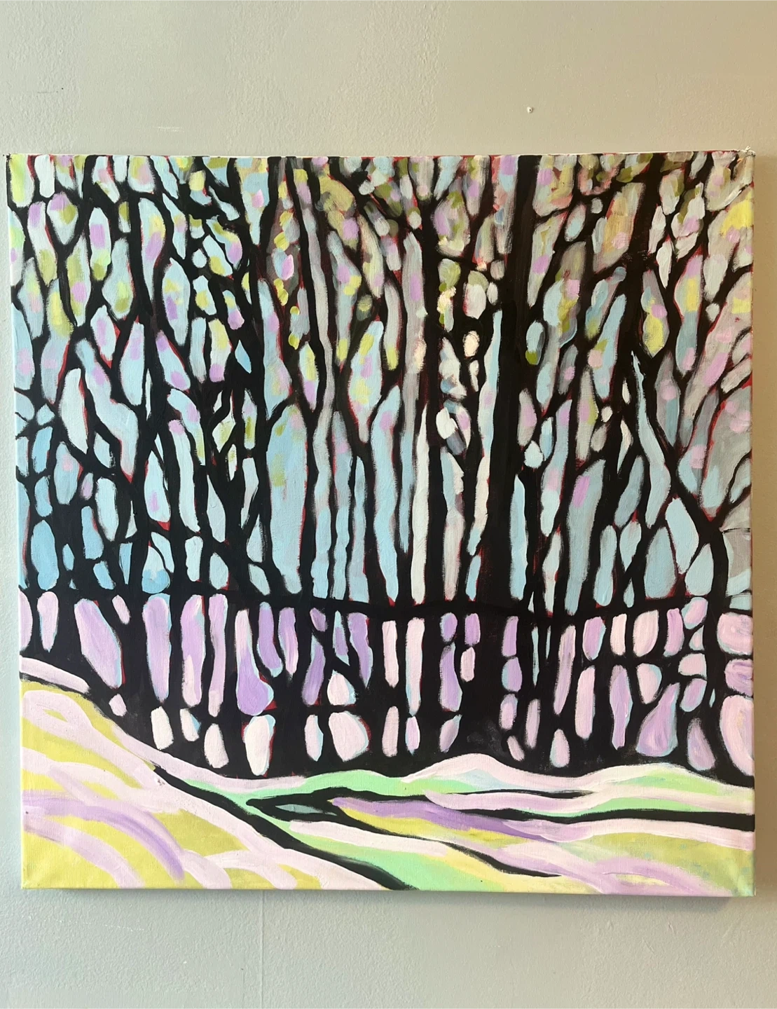 This is an original abstract acrylic painting on canvas depicting a forest landscape in Algonquin. It features a stylized rendition of trees with a pastel colour palette for the snow and sky. Adds a pop of colour to any room!