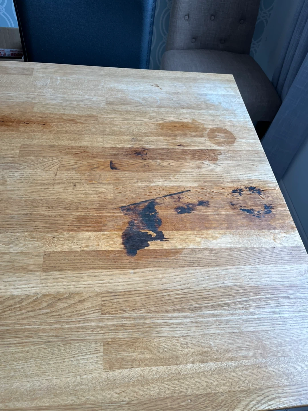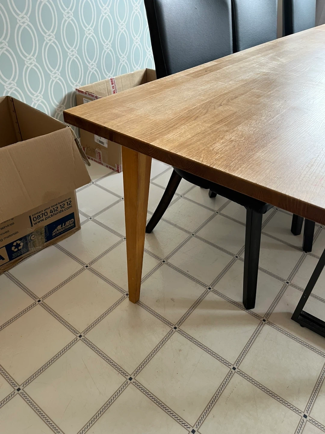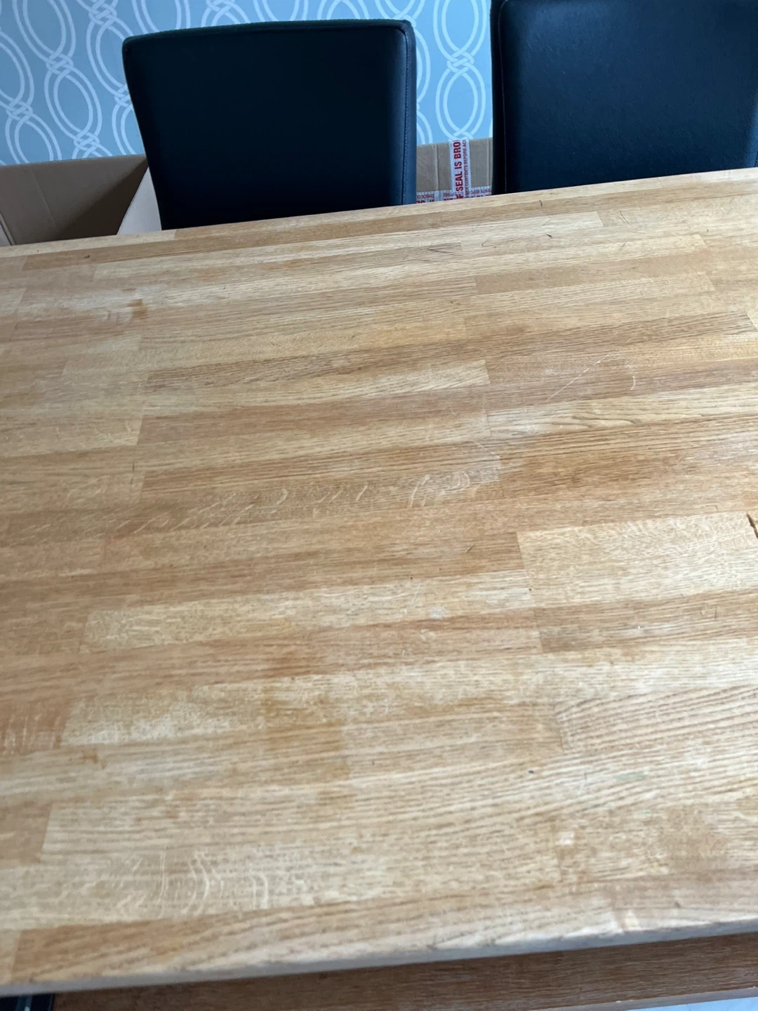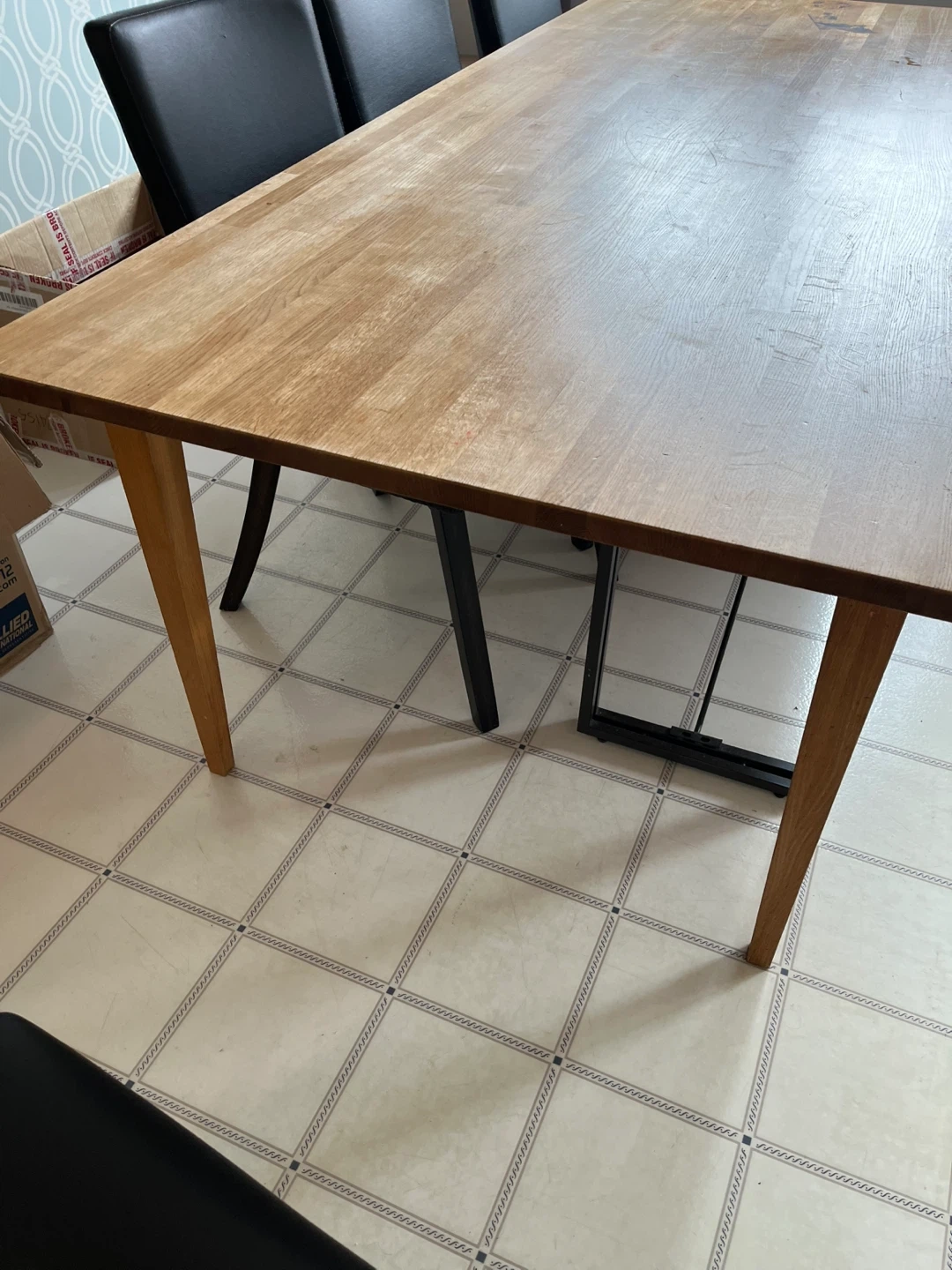 This is a wooden dining table. It's made of oak wood with plank detailing. Some staining and marks are visible on the surface, especially on the end section. The table has a modern design with angled legs and would be useful for everyday meals.