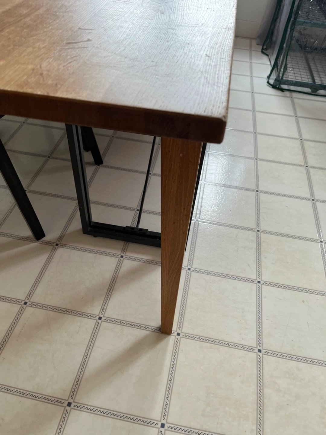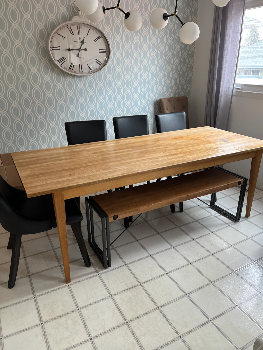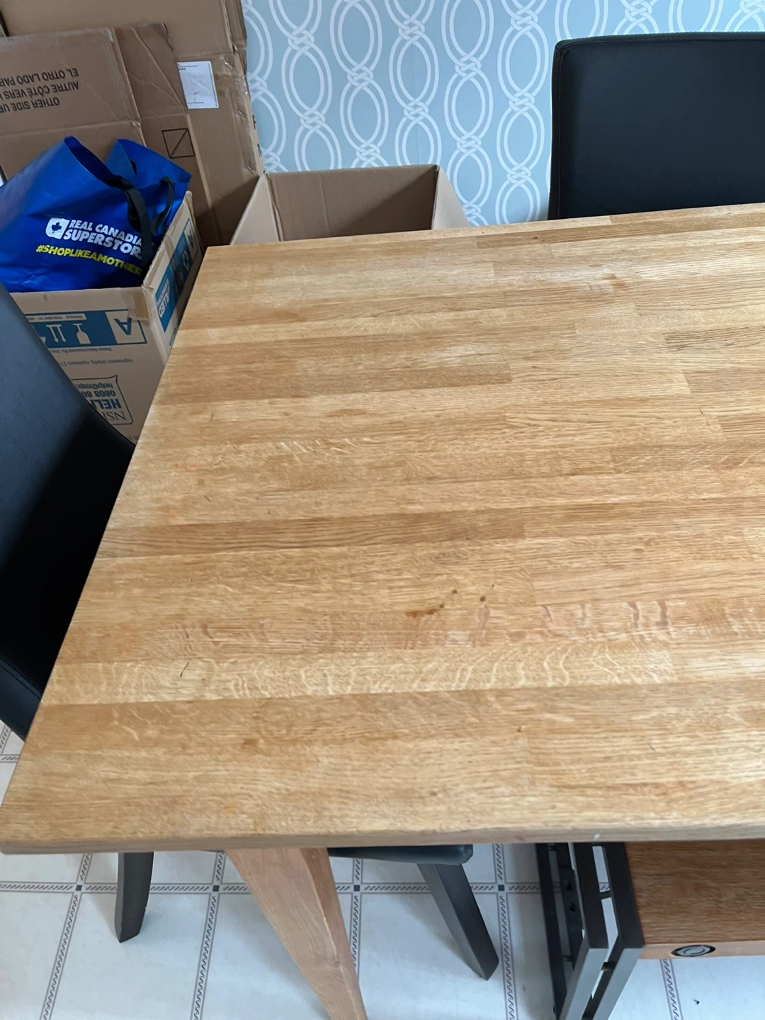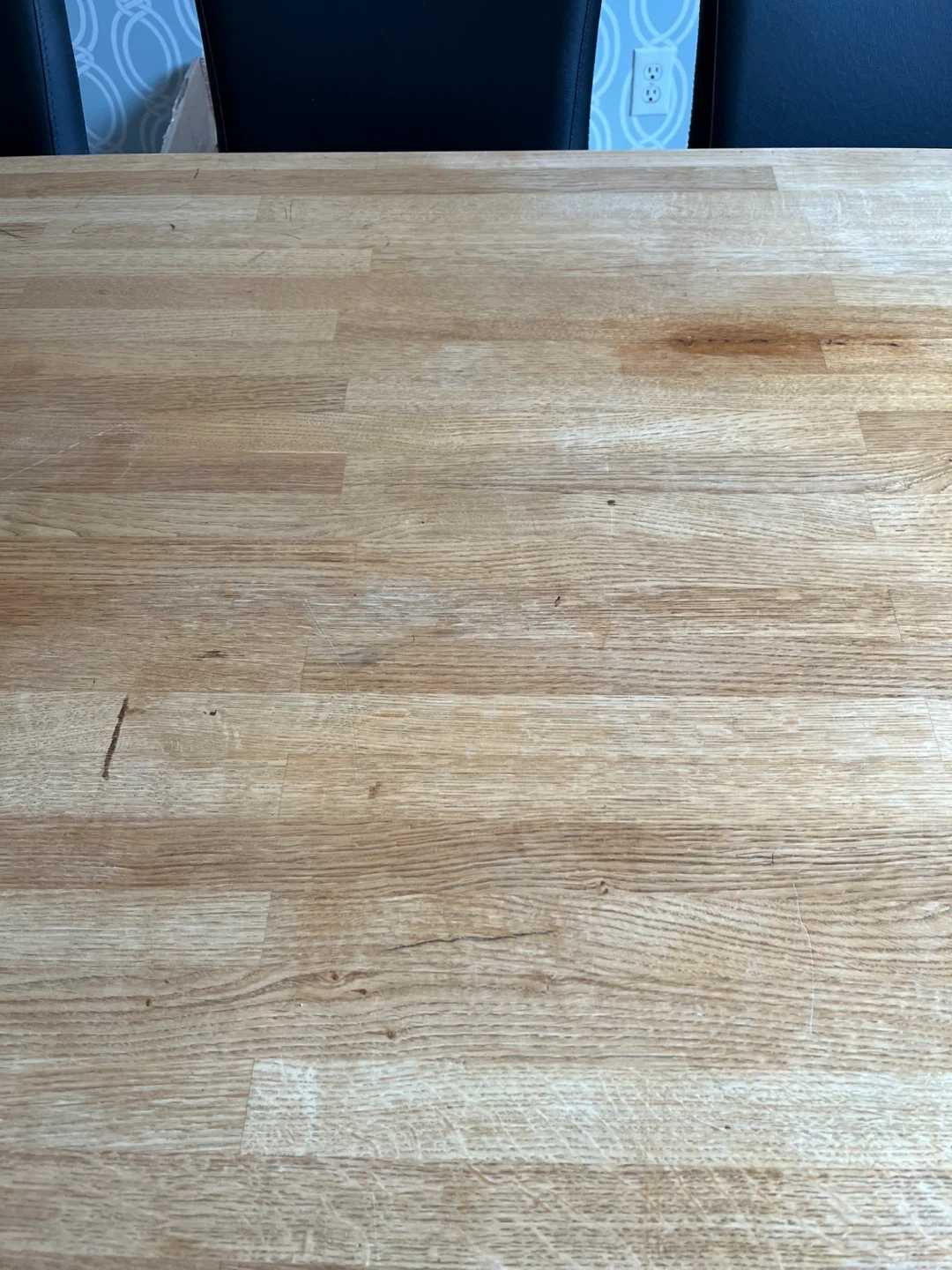 This is a wooden dining table. It's made of oak wood with plank detailing. Some staining and marks are visible on the surface, especially on the end section. The table has a modern design with angled legs and would be useful for everyday meals.