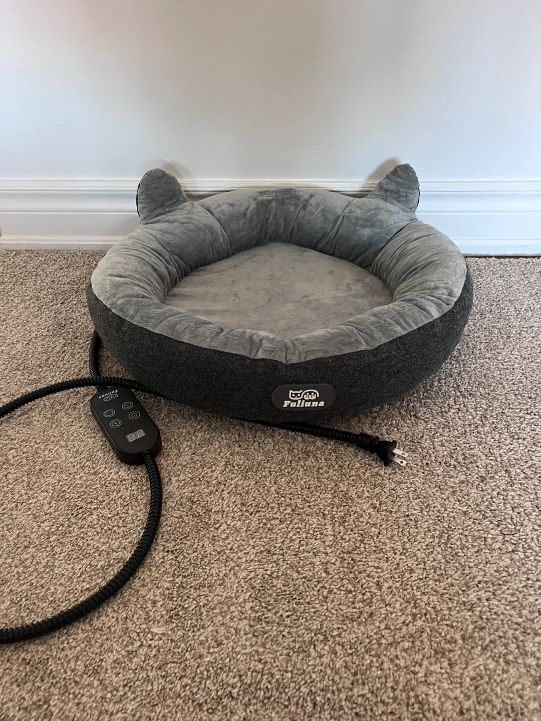 This is a Fuliana brand heated pet bed in grey. It features adjustable temperature control. Plush, soft material for comfort, never used! Great for foster kittens, or elderly cats that need extra heat :)