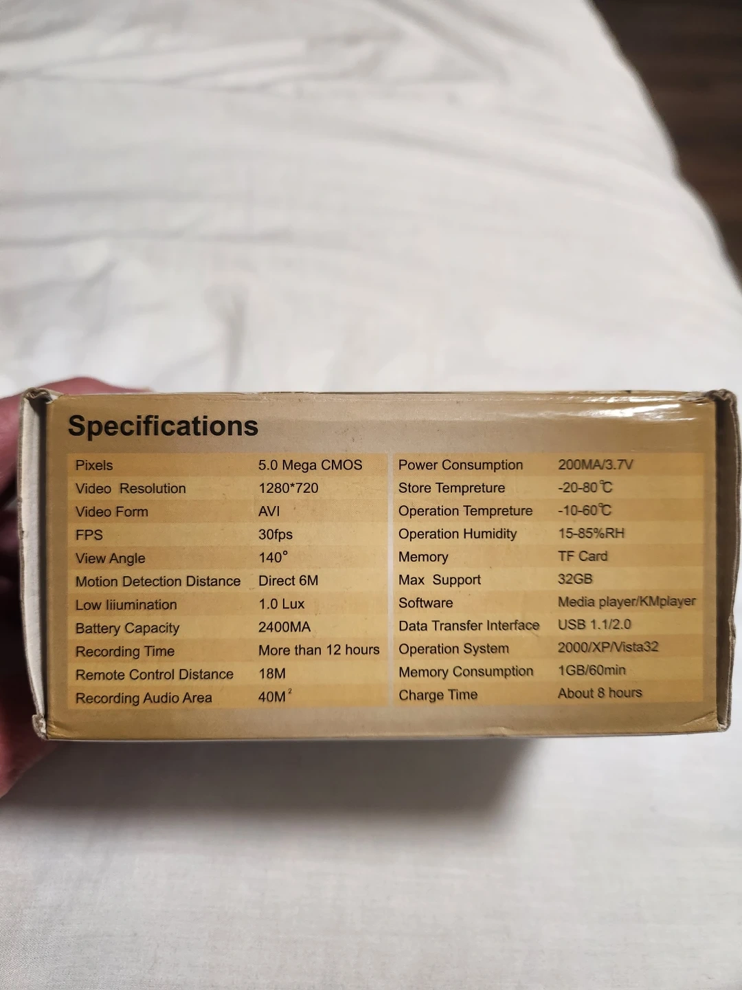 This multi-function clock DVR records video at 1280*720 resolution and 30fps. It has a 140-degree view angle and motion detection up to 6m. Recording time is more than 12 hours on a single charge, which takes about 8 hours.
