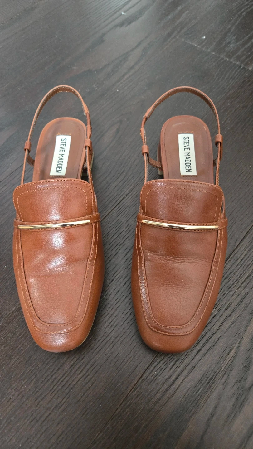 Steve Madden Calibra slingback loafers in a rich cognac leather. These shoes feature a stylish gold-tone hardware detail on the vamp. Heel height is low and comfortable. They're a size 7.5.