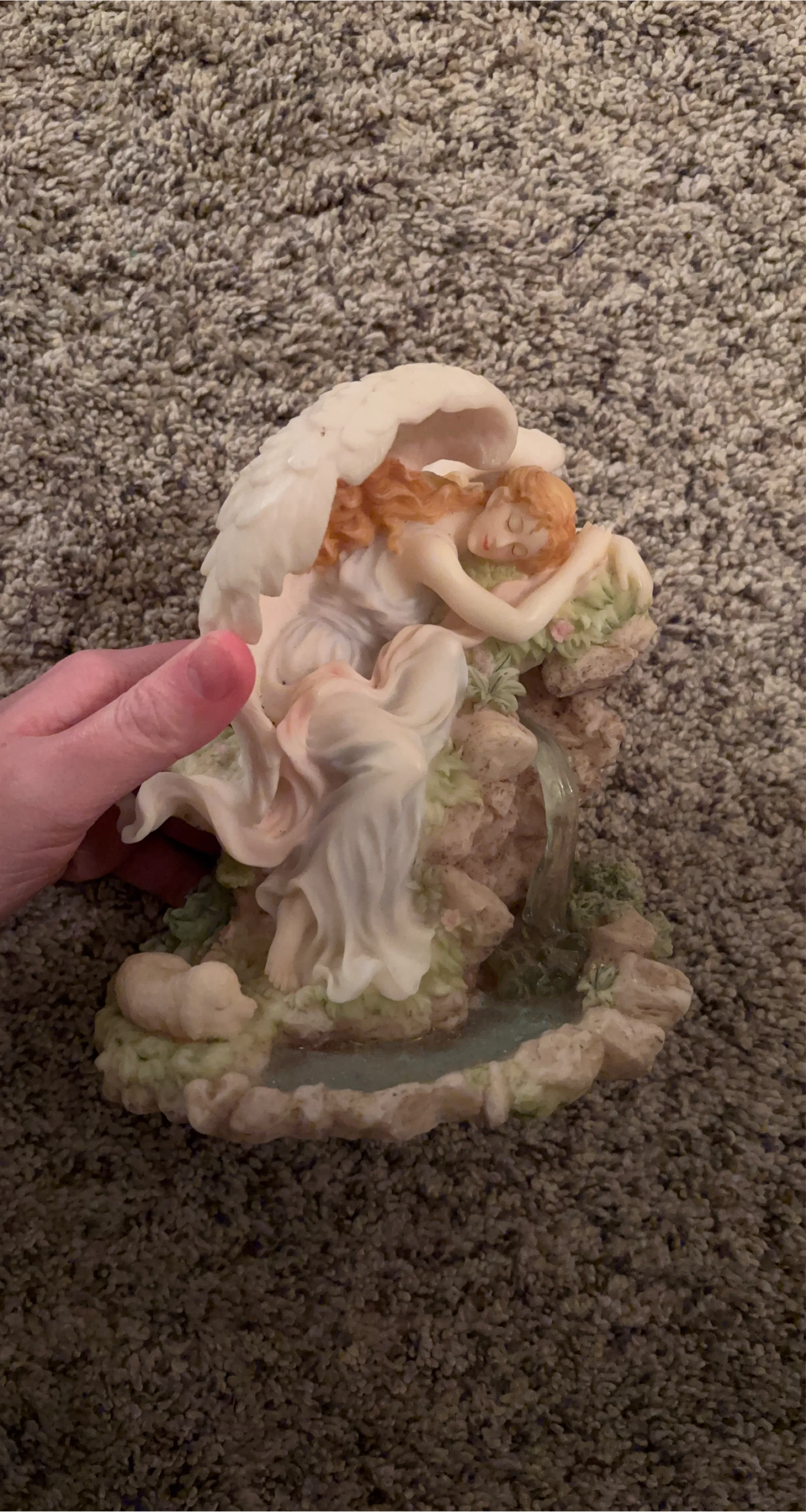 Beautiful resin figurine featuring an angel sleeping by a waterfall. It includes a small lamb at the base. This piece would make a lovely addition to any display.