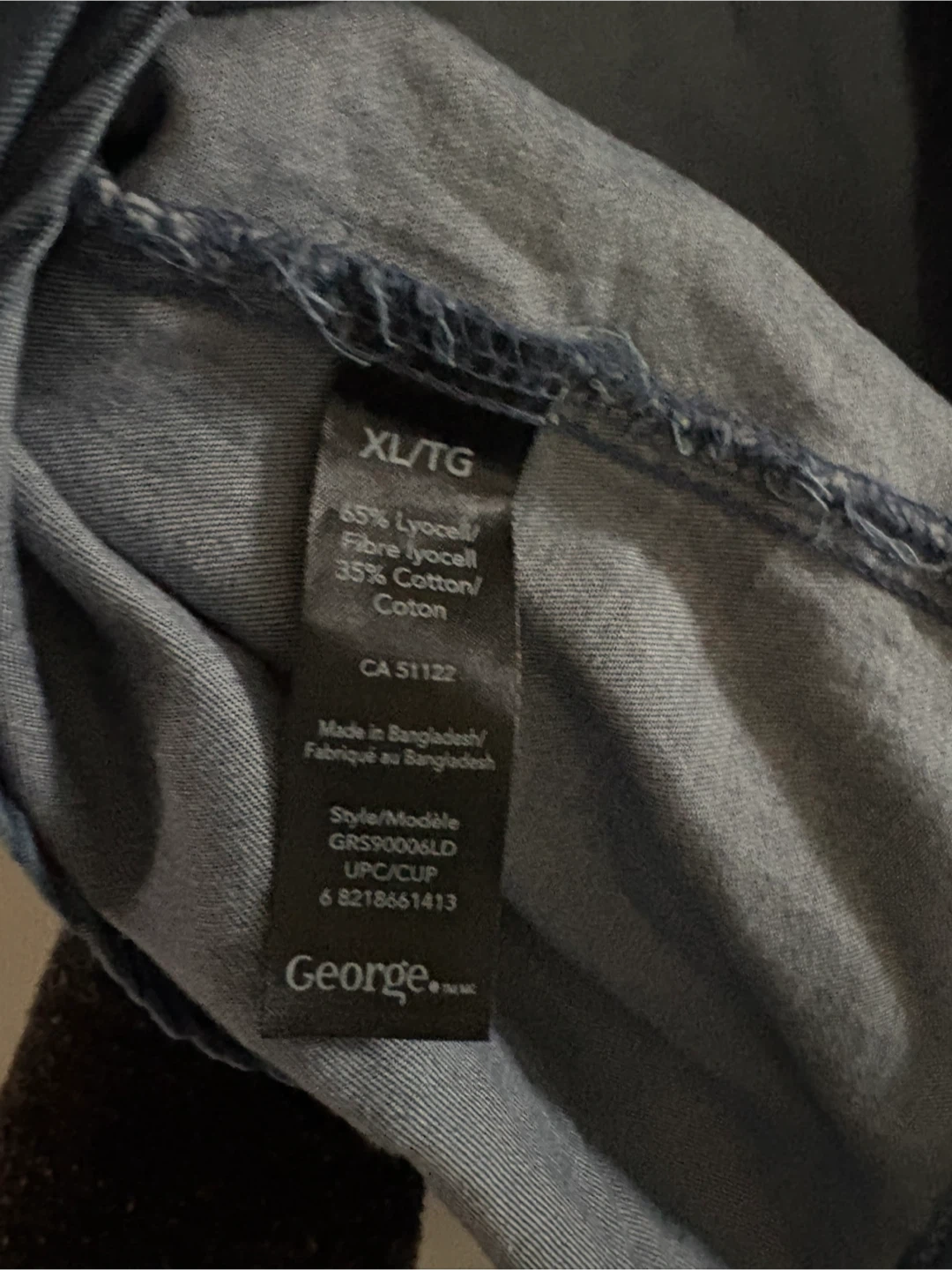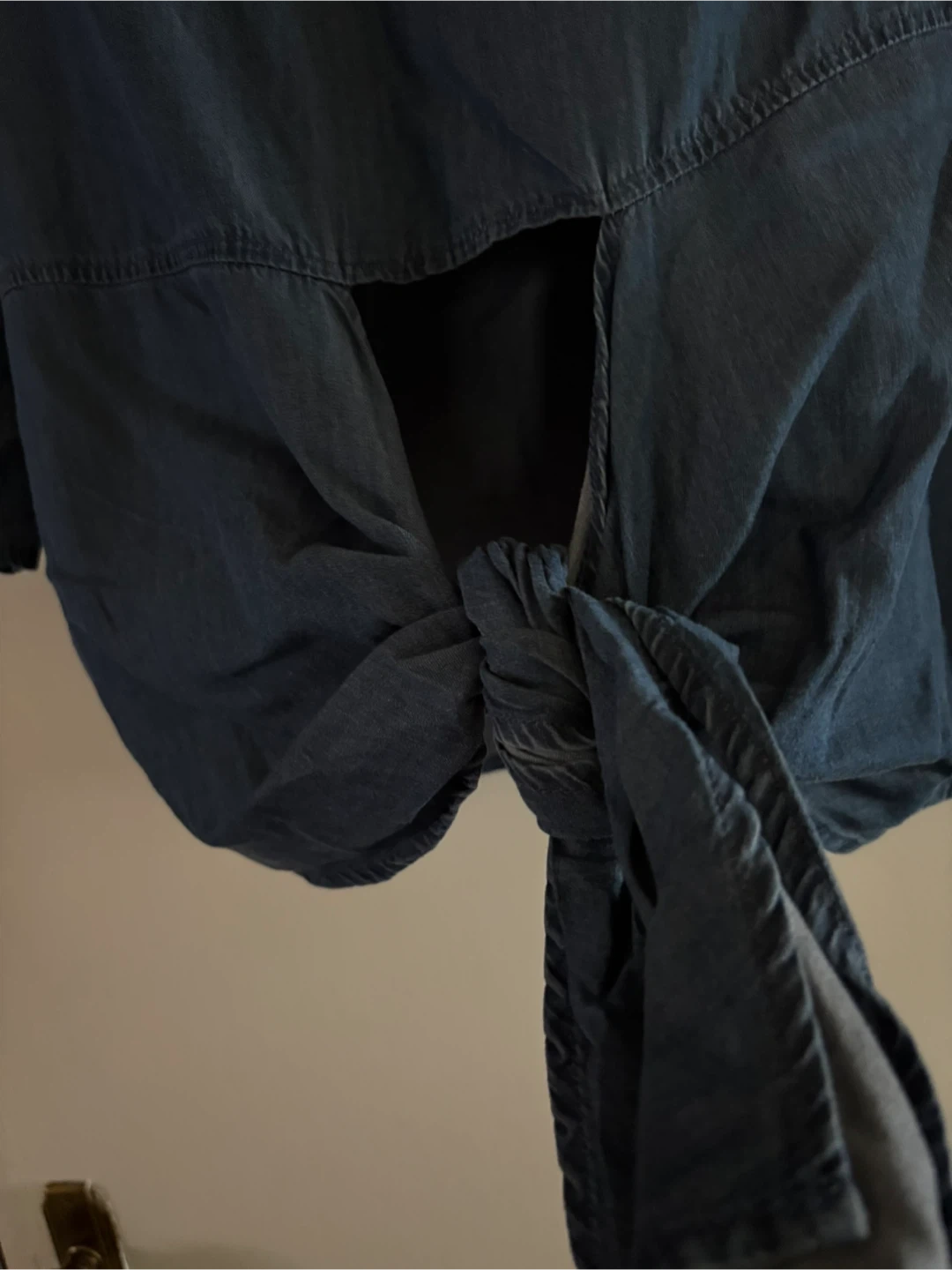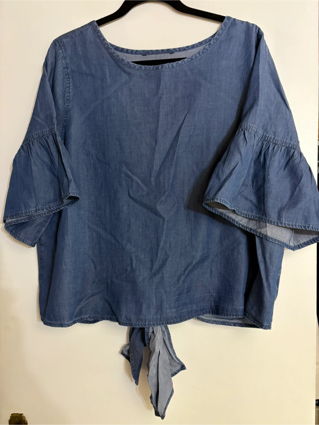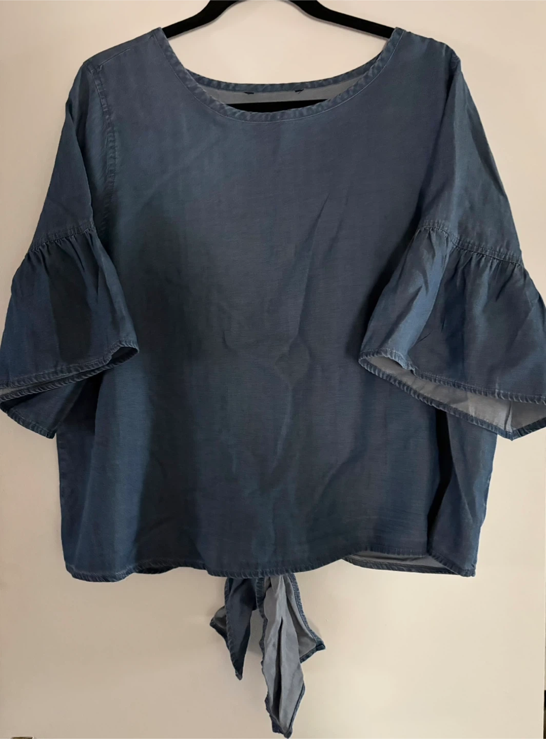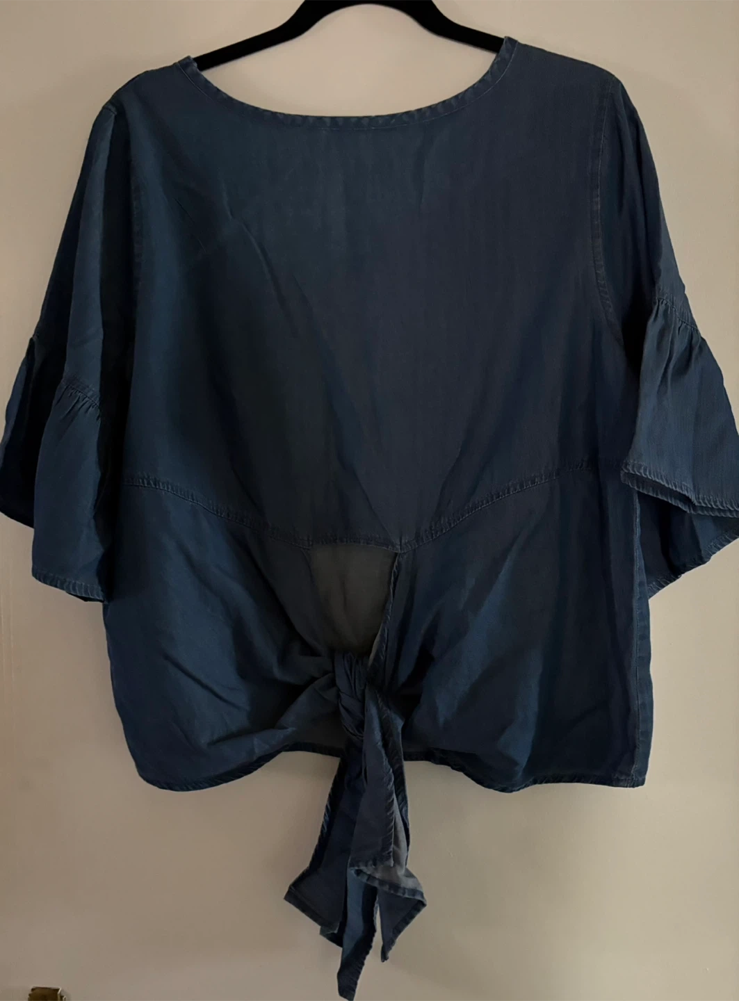 A cute blue denim blouse with a tie-back detail. It has a round neckline and short, fluttery sleeves. Perfect for a casual day out!