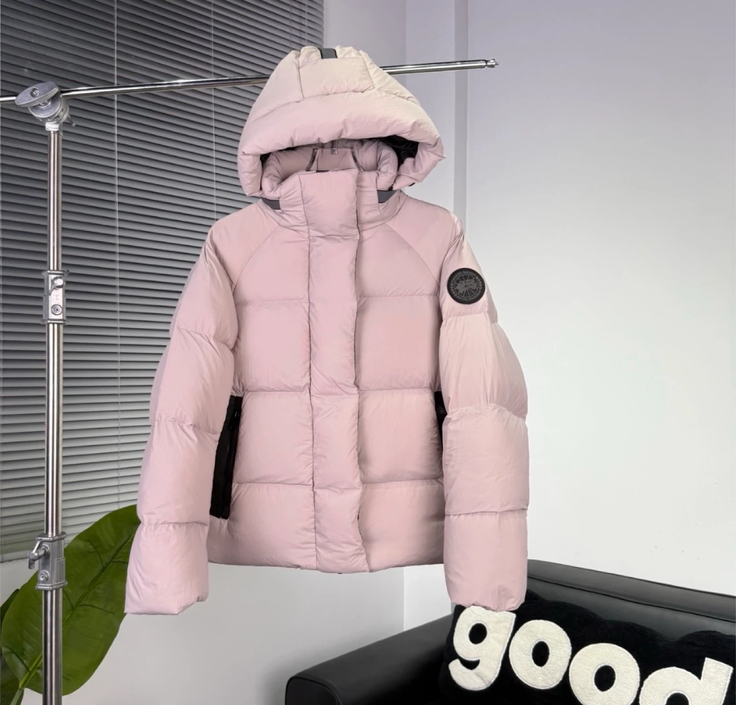 This Canada Goose puffer jacket is a lovely shade of pink. It's designed for warmth and comfort. It features a full zip closure and a cozy hood.
