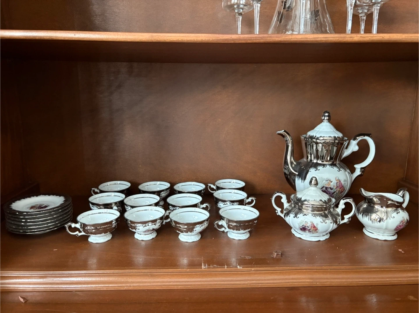 This is a vintage teacup and saucer set with a teapot, sugar bowl, and creamer. It features a silver-toned finish with decorative accents. It includes 12 teacups, 12 saucers, one teapot, one sugar bowl, and one creamer. This set is lovely for serving guests or for decorative display. Pick up from Dufferin/glencairn